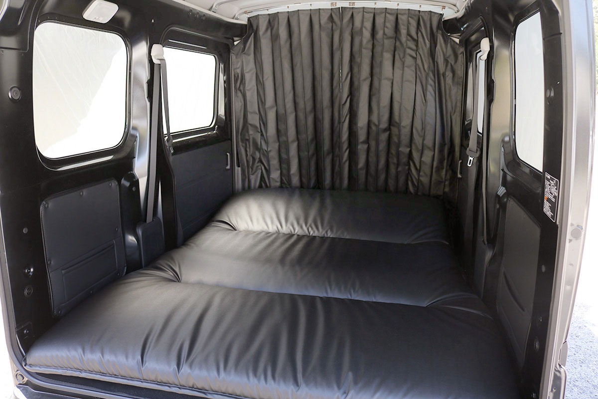 S700V系ハイゼットカーゴ&アトレー専用に仕上げた間仕切りカーテンに注目。ステンレス製の専用レールに、しっかりとしたPUレザー生地を合わせた間仕切りカーテンにより、フロントシートとリア空間を分割。日差しや車外からの視線や防音効果に加え、エアコンを効率的に使うことができる。