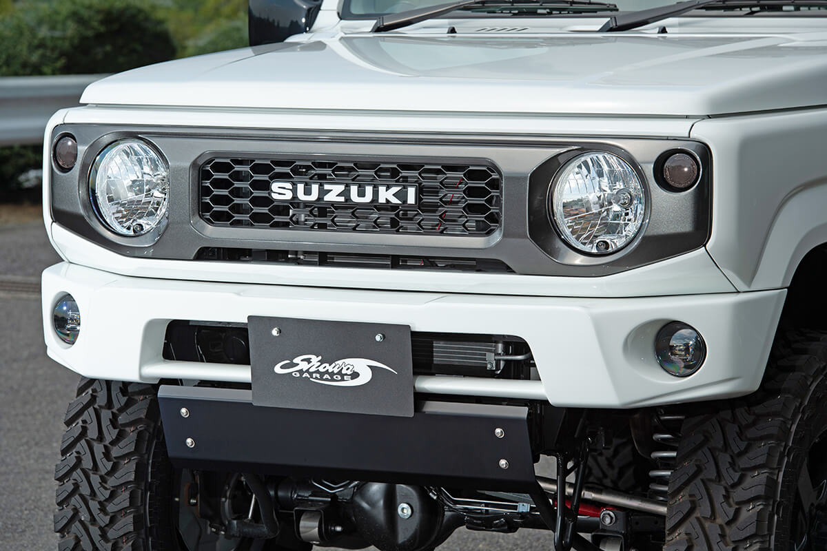 エクステリアの印象をガラリと変えるパーツがバンパーだ。ジムニーのノーマルバンパーはボディに対してやや大きめな印象で、しかも無塗装なので高級感がない。そのためパーツメーカー各社はそれぞれ独自なデザインのバンパーを出しており、ショウワガレージも「フロントバンパースポイラー」と名づけたバンパーを用意している。