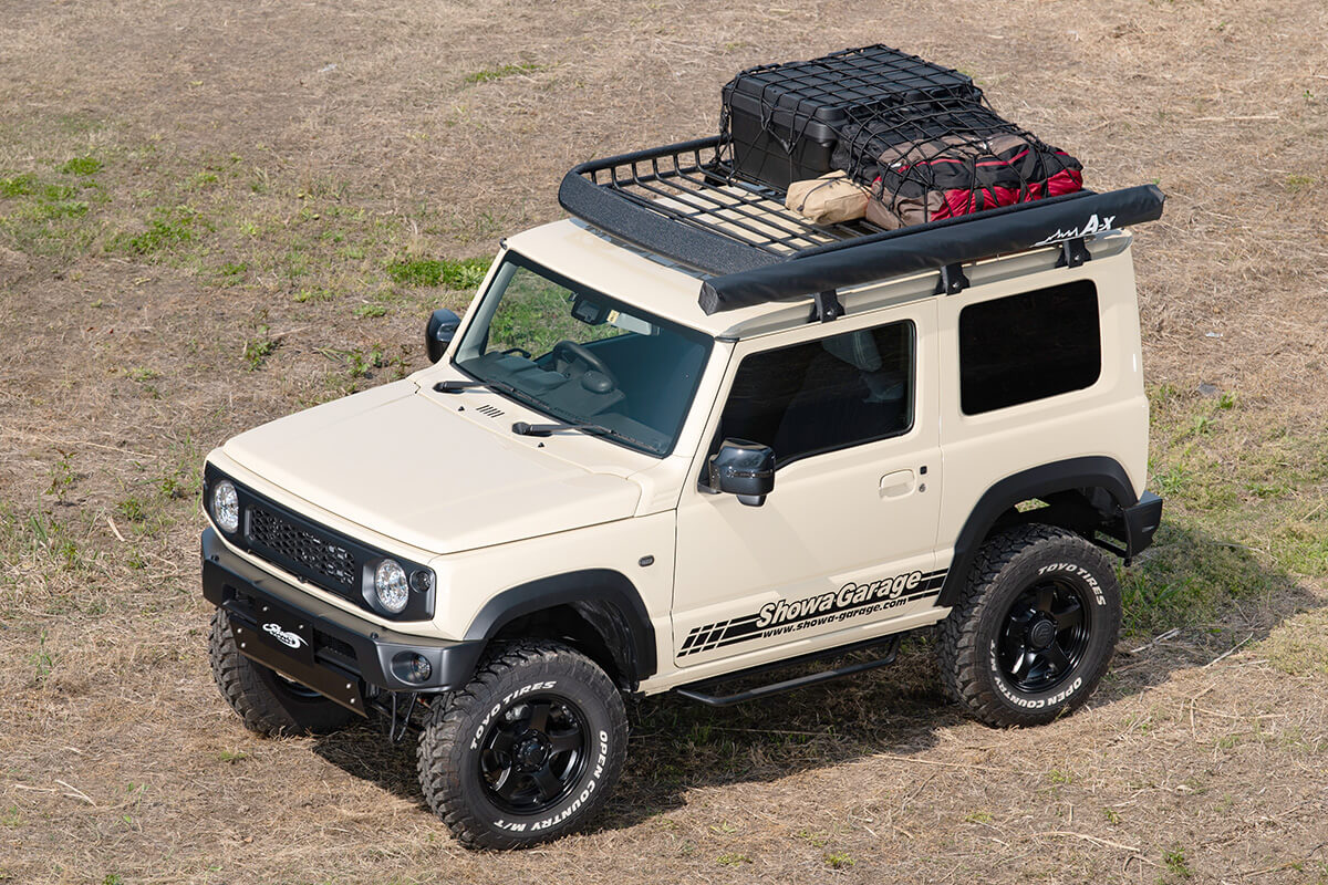 ショウワガレージのオリジナルブランド、A-X(エークロス)では多種多様のアウトドアアイテムを取り揃えているが、中でも人気なのがルーフラックだ。そのサイズは多岐にわたるが、ジムニーにおススメなのがMスーパーワイド、そしてLワイドだ。