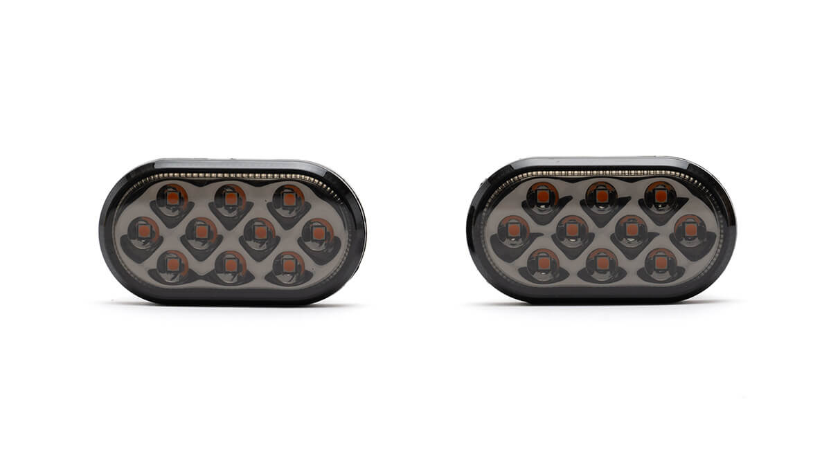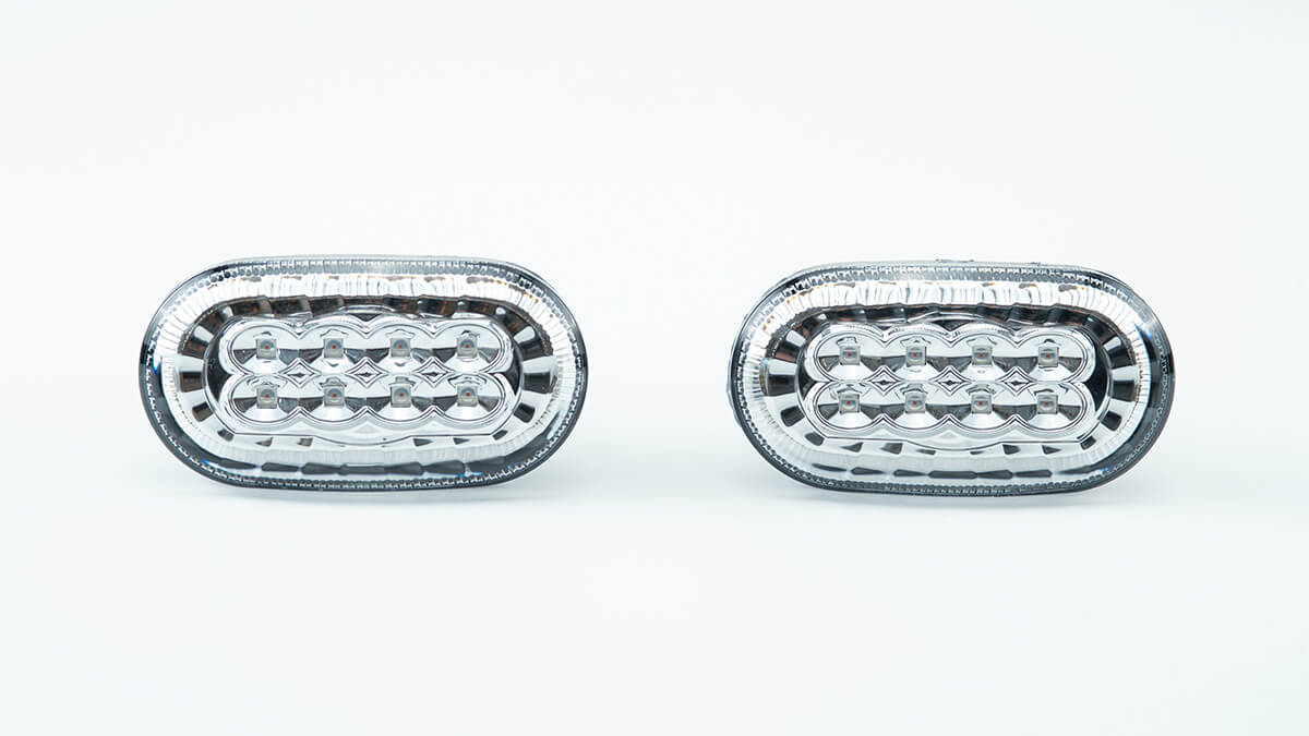 「ノーマルのサイドマーカーはオレンジ一色で、いかにもノーマルといった雰囲気ですが、弊社のサイドマーカーはレンズ面のカットをなくすことで内部のLEDチップを見せています。LEDチップが8個のタイプ1と、チップが10個のタイプ3を用意していて、レンズはクリアとスモークの2種類、インナークロームとインナーブラックがあり、全部で8種類となります」(ショウワガレージ店長・伊神敬太郎さん)