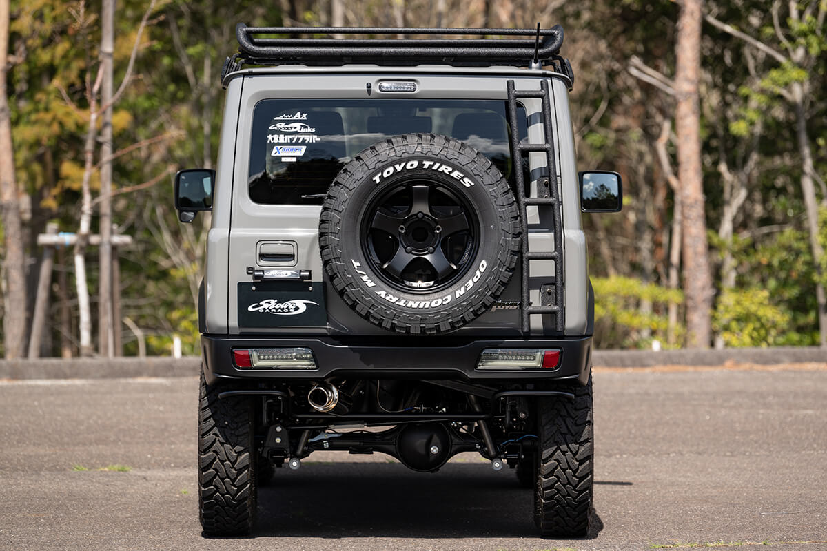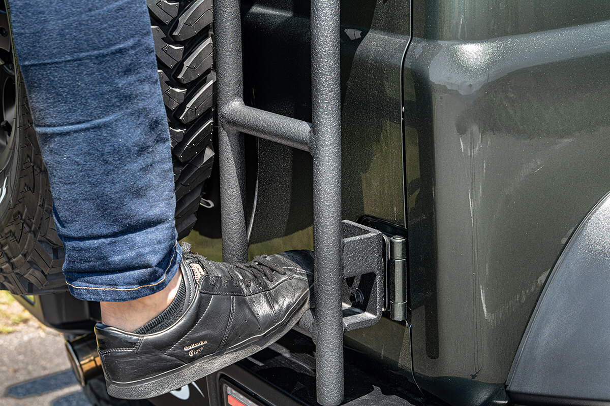ルーフラックを取り付けたら、ルーフへのアクセスをより容易にするリアラダーも欲しいところ。ラダー本体はアルミ製で、カラーはルーフラック同様ブラックの結晶塗装だ。このラダーにはスペアタイヤの位置に応じて幅の狭いタイプと幅が広いタイプを用意している。