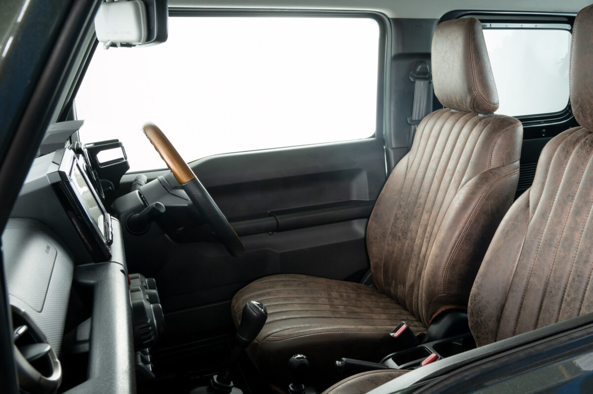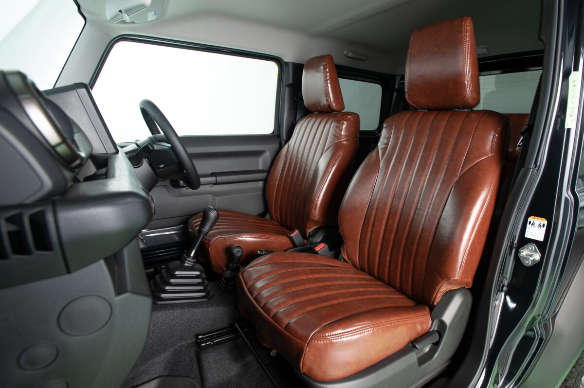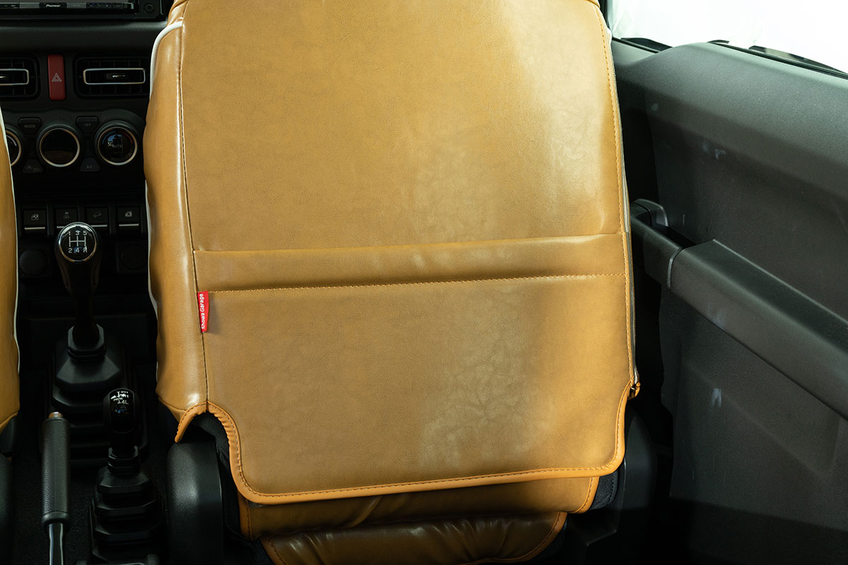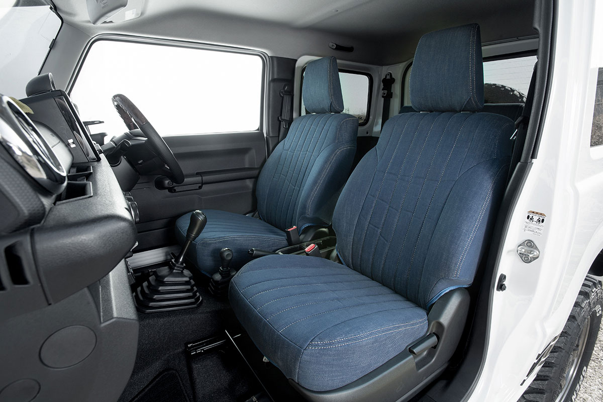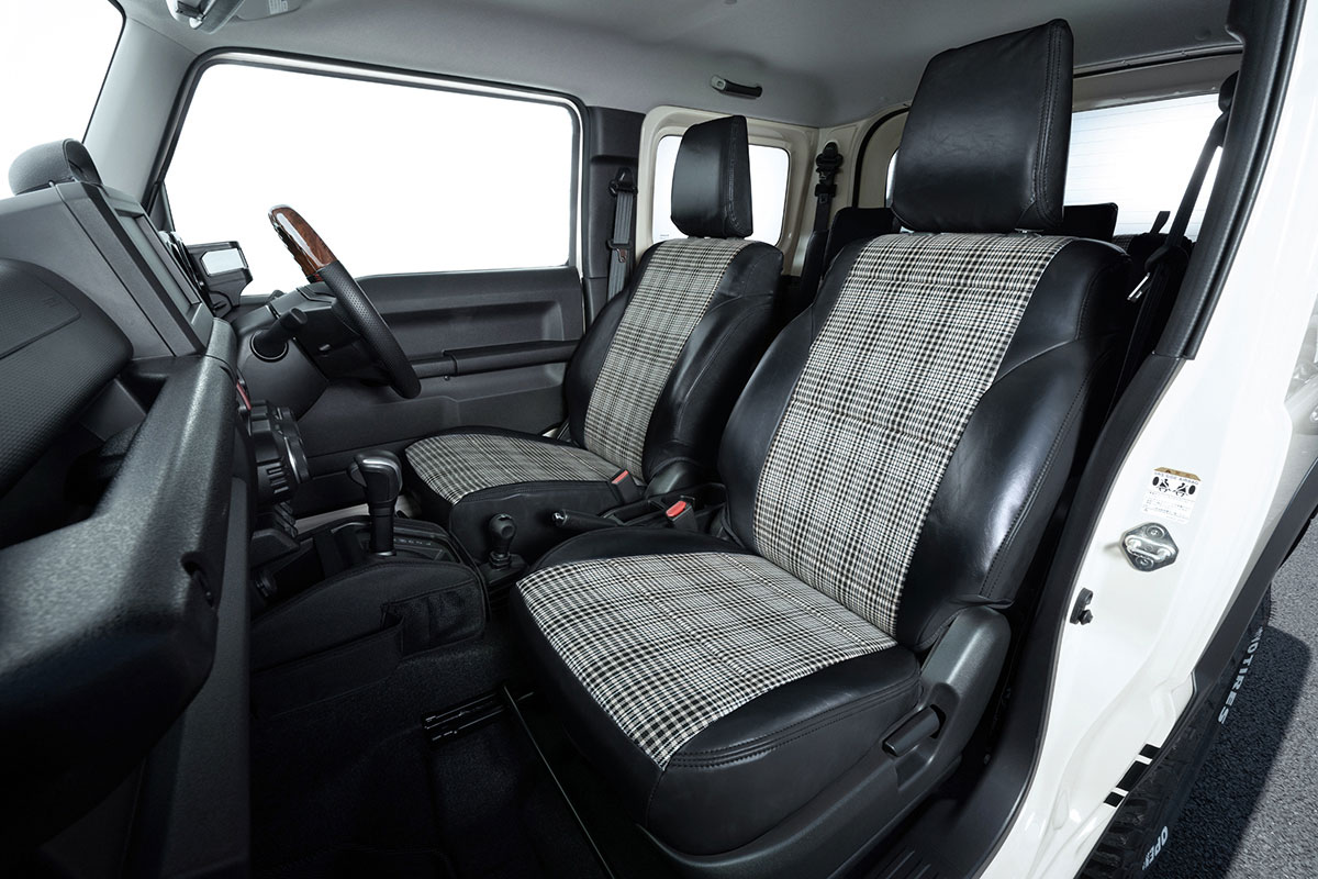 インテリアの雰囲気に大きく影響するのがシートだ。ノーマルのジムニーのシートは全車種共通で、没個性的な印象だが、シートカバーを使うことでその印象は大きく変化する。同社では全面フェイクレザーのタイプ、一部にチェック柄のファブリックを使用したコンビネーションタイプ、そしてデニム素材などを用いており、カラバリを含めるとラインナップ数は全16種類にも及んでいる。