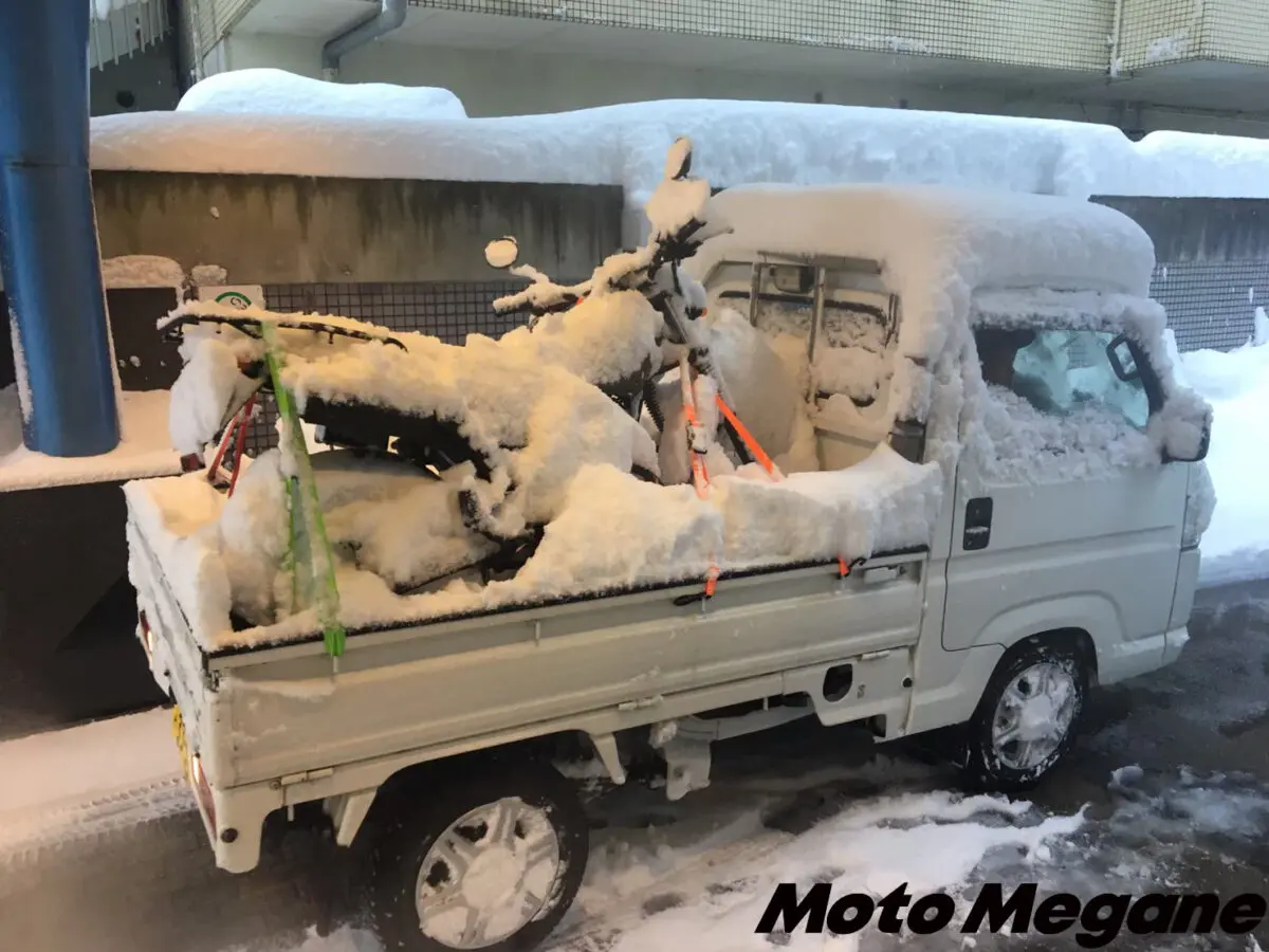 我が家で最重量(200㎏)を誇る大型バイクを積載して急な上り坂でテストをしてみた。もともとアクティトラックは登坂性能を追求した低速トルク型エンジン+超が付くほどのローギヤミッションなので「お? エンジンが力強くなったかな?」レベルの曖昧な印象だったが、1点だけ大きく変わった。