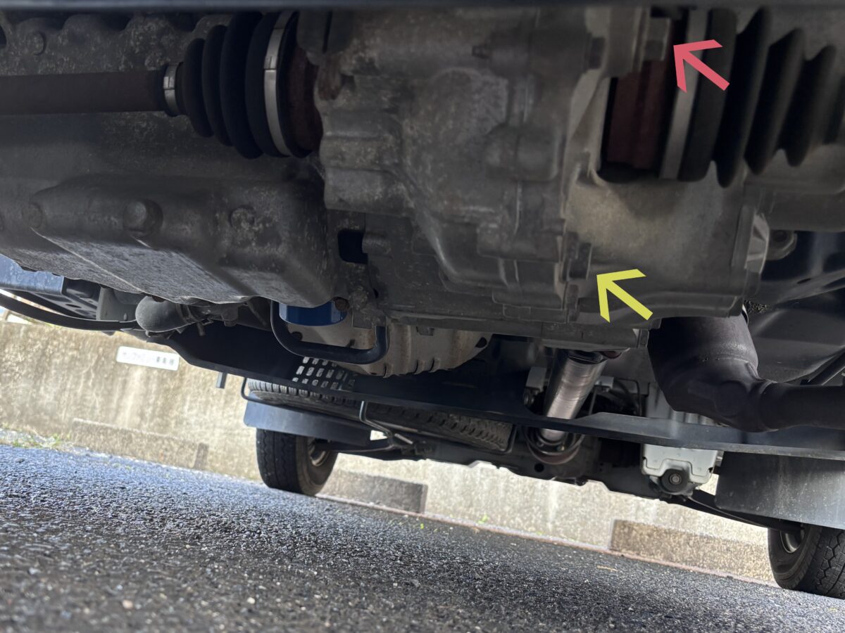 赤矢印がミッションオイル注入口で、黄色矢印がドレン