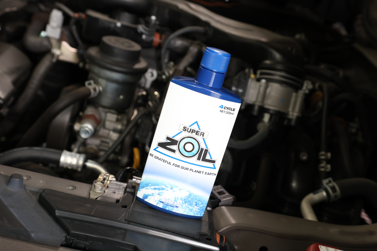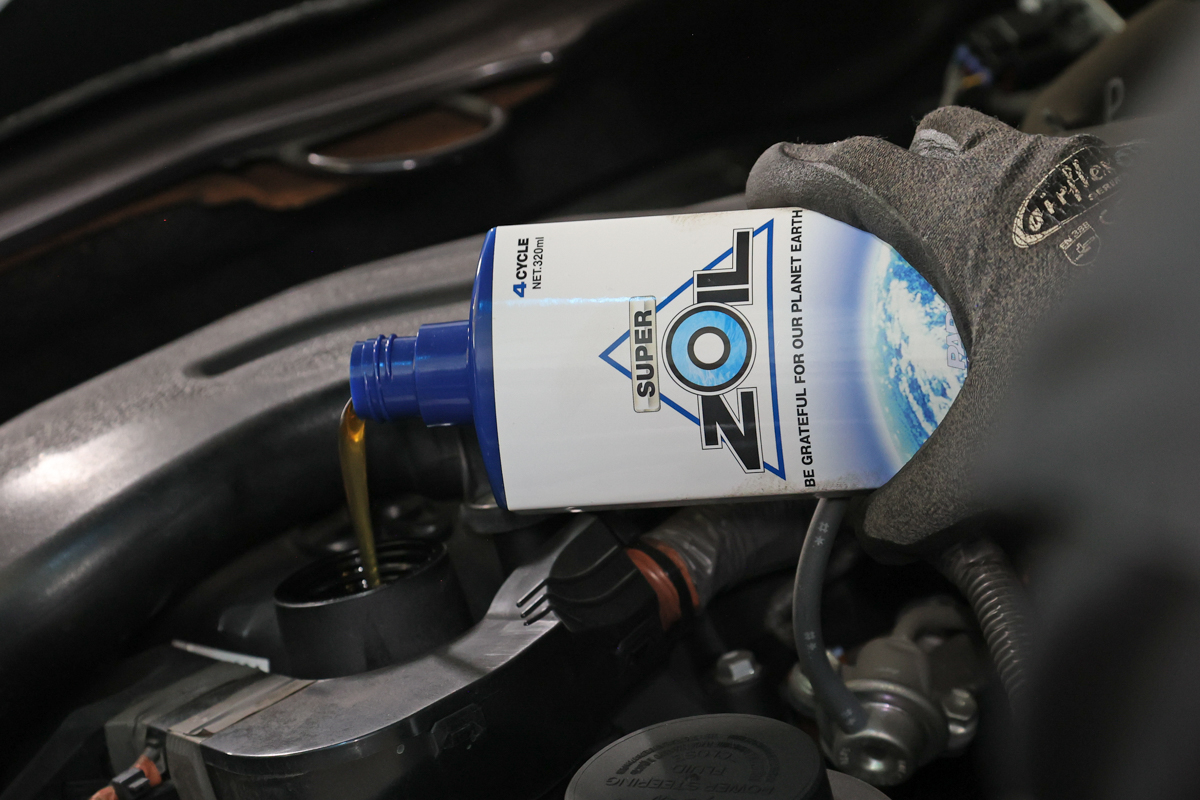 現在、4サイクルエンジン用のエンジンオイル添加剤としては、「スーパーゾイル ECO for 4cycle」と従来品の「スーパーゾイル for 4cycle」の2種類があり、今回はこのうち「ECO」をテスト。こちらは、成分配合をさらに濃縮することにより、従来品と比べて半分の使用量で同等の効果を発揮できるよう開発された製品で、よりコストパフォーマンスに優れる(最小の200mlボトルで7480円)。ガソリンエンジンとディーゼルエンジンのどちらにも使用可能で、エンジンオイル総量の5%が「スーパーゾイル ECO for 4cycle」となるよう、エンジンオイル注入口から添加するのが基本的な使用方法だ。