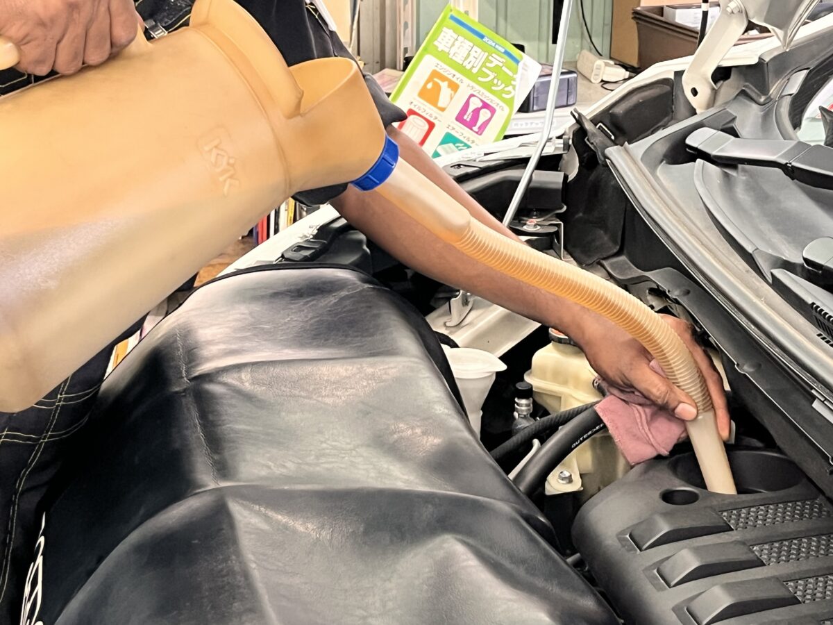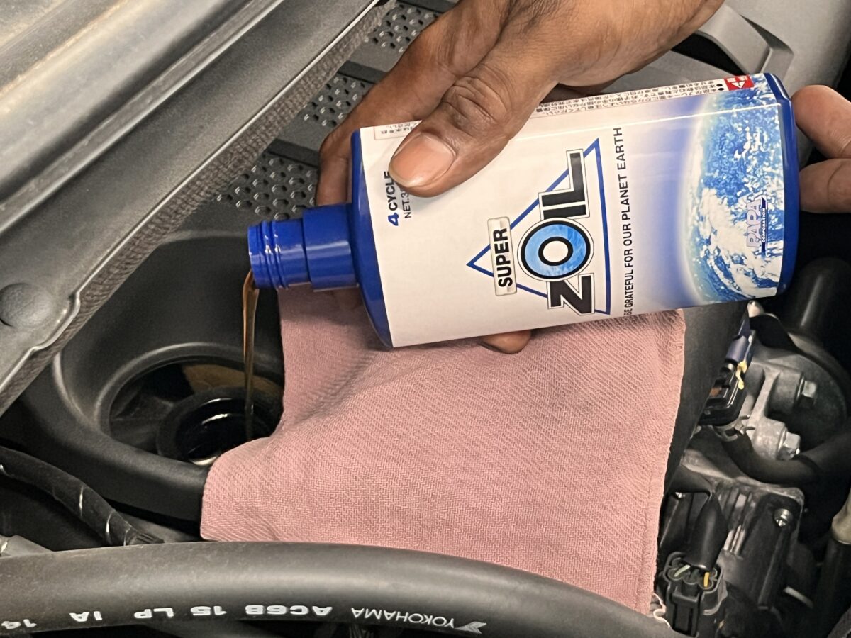 通常のオイル交換のあと、オイルの規定容量に対してスーパーゾイルエコを5%注入する。