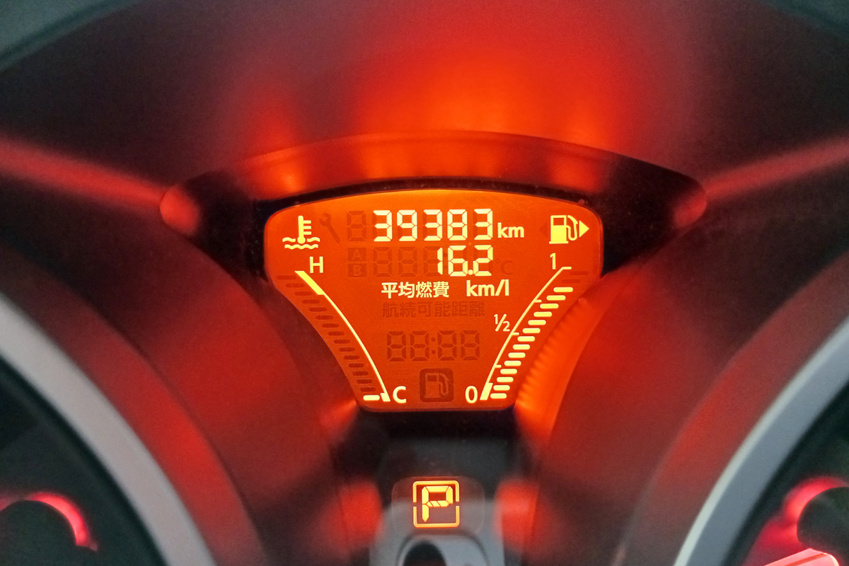 ジュークのオーナーは、クルマやバイクのメディアで大活躍中のカメラマンで、仕事の移動でクルマをフル活用するため、年間走行距離は2~3万kmにおよぶ。この車両を購入してから約4ヵ月間で7367kmを走行しており、その間の平均燃費は16.2km/Lをマークしている(データはいずれも車両のメーターによる)。カタログ記載のJC08モード燃費は13.4km/Lなのだが、高速道路走行率が非常に高く、ほとんど2WDモードで走行し、なおかつオーナーはそれほどトバす運転をしないため、かなりの低燃費を記録している。