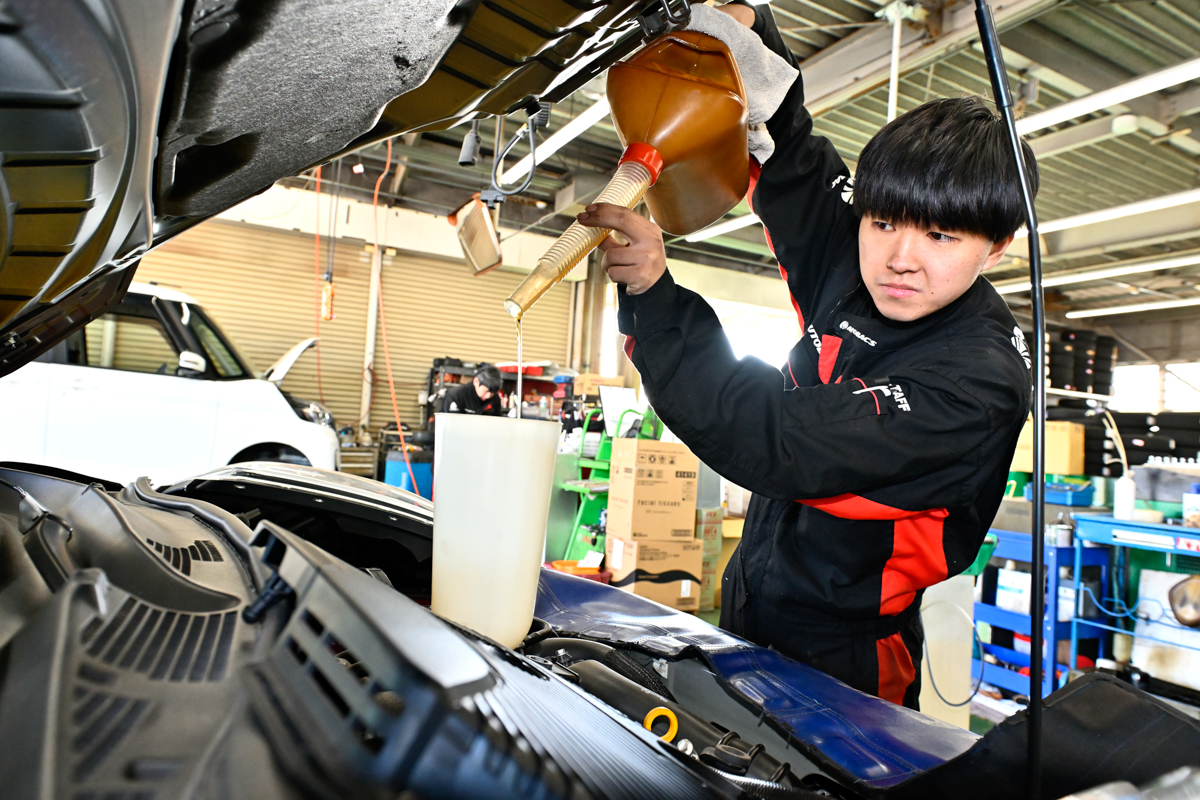 この年式と仕様のジュークには省燃費のAPI:SN/SAE:0W-20が指定されており、今回は純正同等のエンジンオイルを選択。銘柄は元のエンジンオイルと同じではないが、オイル粘度が燃費などに与える影響を最小限に抑えた。担当メカニックによると、「抜いたエンジンオイルはそれなりに汚れているが、酷い状態でもない」とのこと。スーパーゾイル ECOは、エンジンオイル規定量の5%になるよう添加するのが適量で、このジュークが必要とするエンジンオイル容量はフィルター交換時で約4.3Lなので、215mlを添加する計算となる。