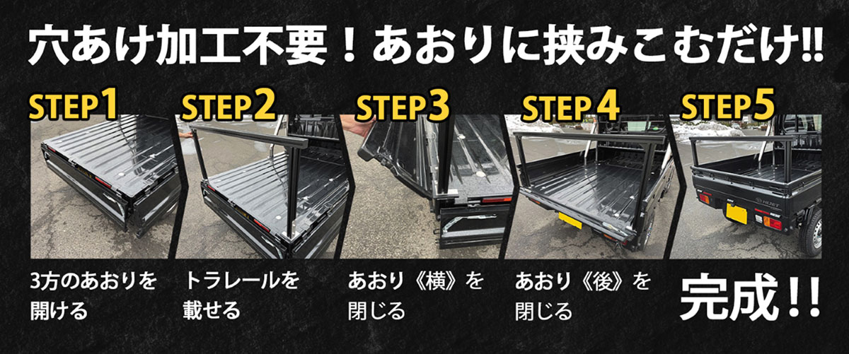 - 側面のアオリを立ち上げて、トラレールのステーを挟み込む。