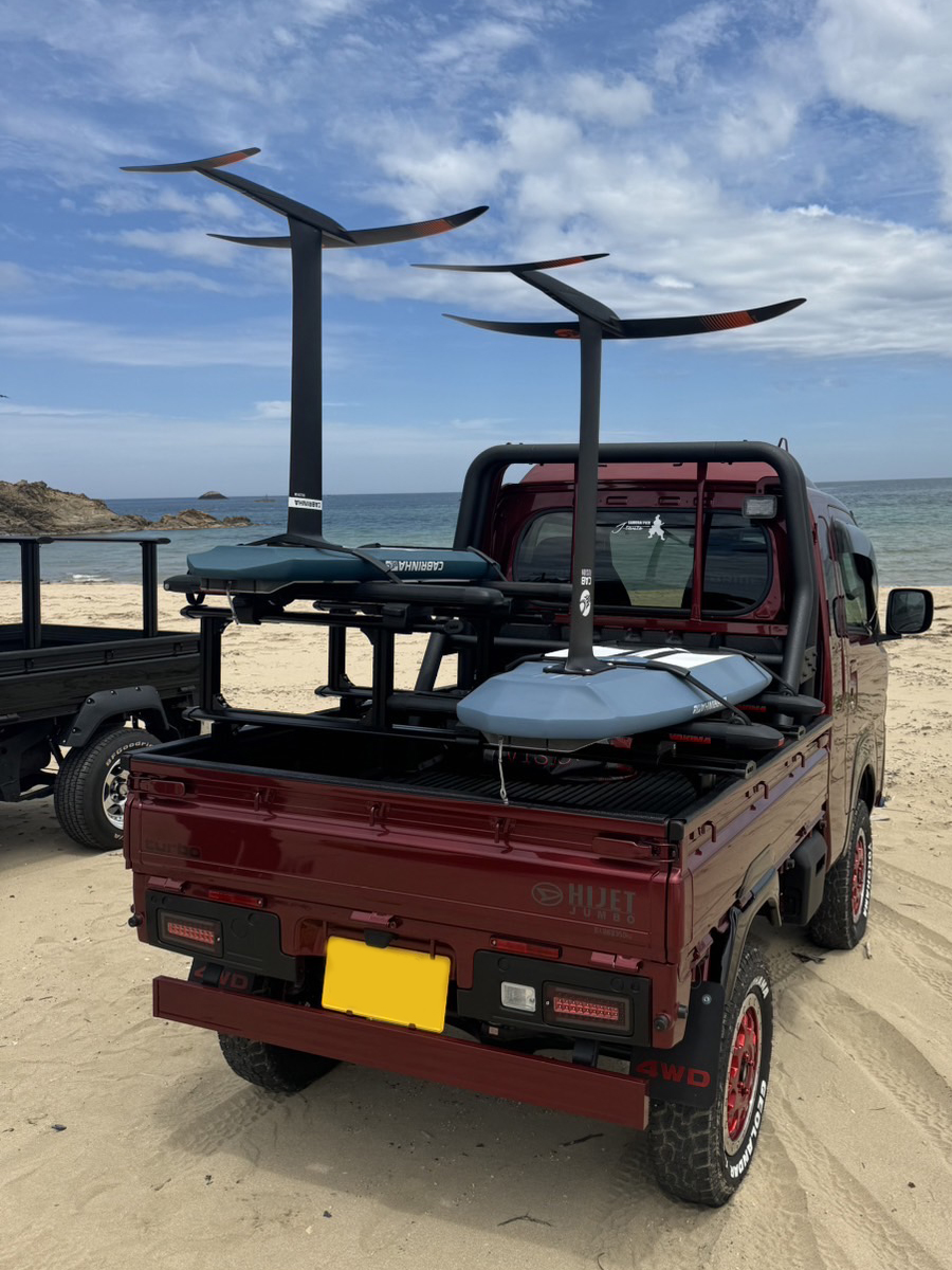 それらの問題をすべて解消するべく、但東自動車が独自に開発したキャリアが、トラレールだ。アオリで挟み込むだけなので、荷物に応じて簡単に脱着できる。アルミ製のため、スチール製よりも軽く、錆びる心配がない。マリンスポーツやフィッシング、降雪地帯で使用しても、まったく問題ないというわけだ。