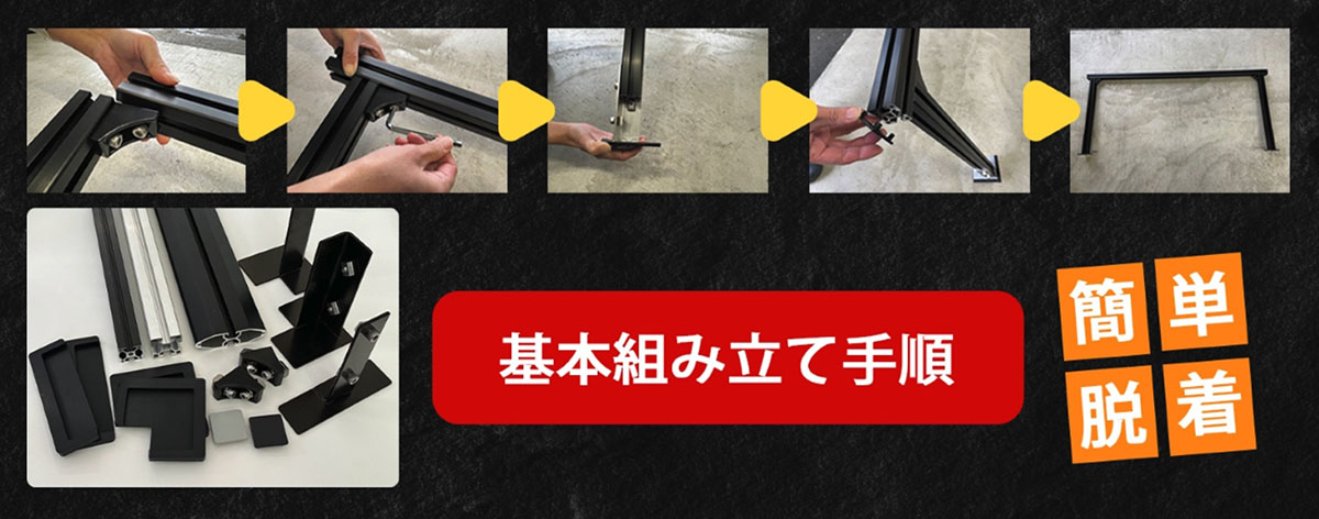組み立ては六角レンチを使い、コーナー金具でバーを固定。土台プレートを取り付けた後に、クッションゴムを装着すれば、組み立ては完成だ。