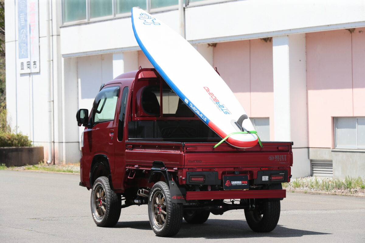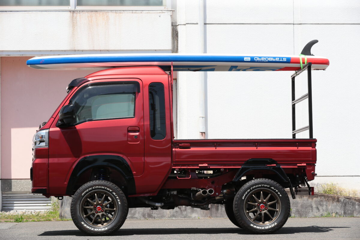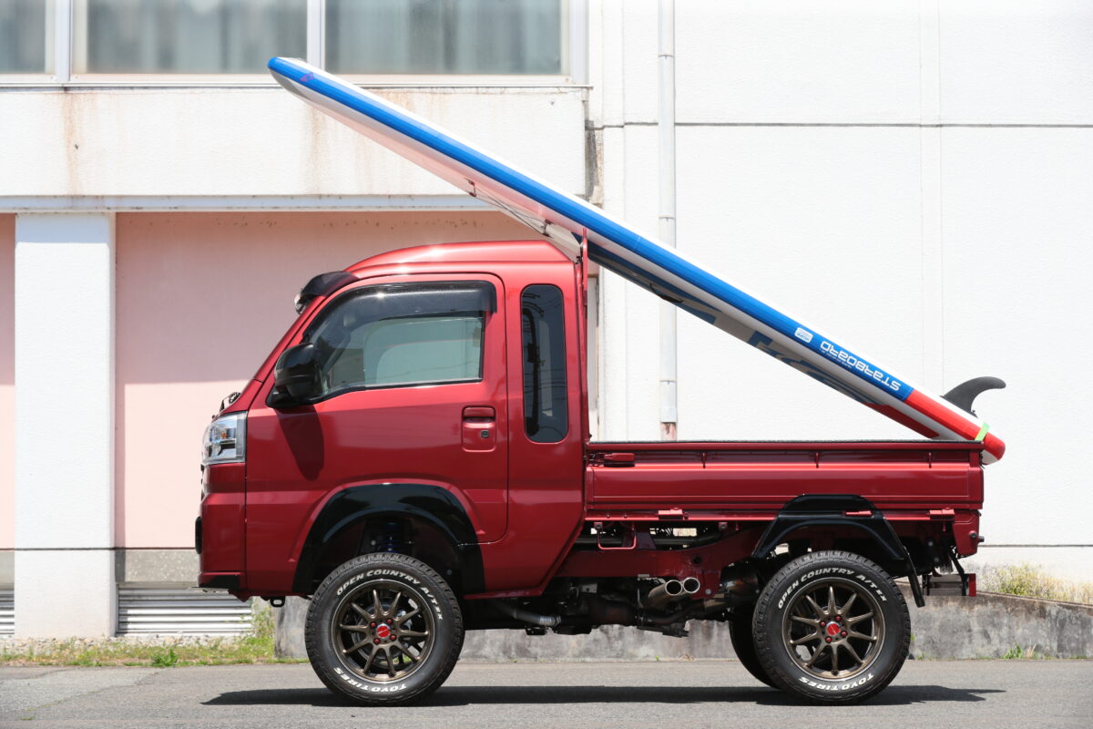 通常のショートボードの全長は、5.6〜6.6フィート(約1707〜2012mm)。ファンボードだと6.6〜8フィート未満(約2012〜2438cm未満)となる。それに対して軽トラの荷台の長さは、スズキ・キャリイ&ダイハツ・ハイゼットトラックで2030mm。ショートボードならば収まるが、ファンボードだと荷台には収まらない。