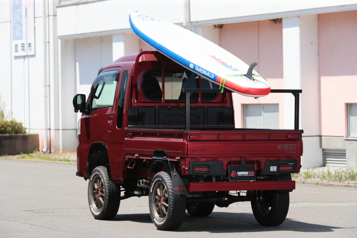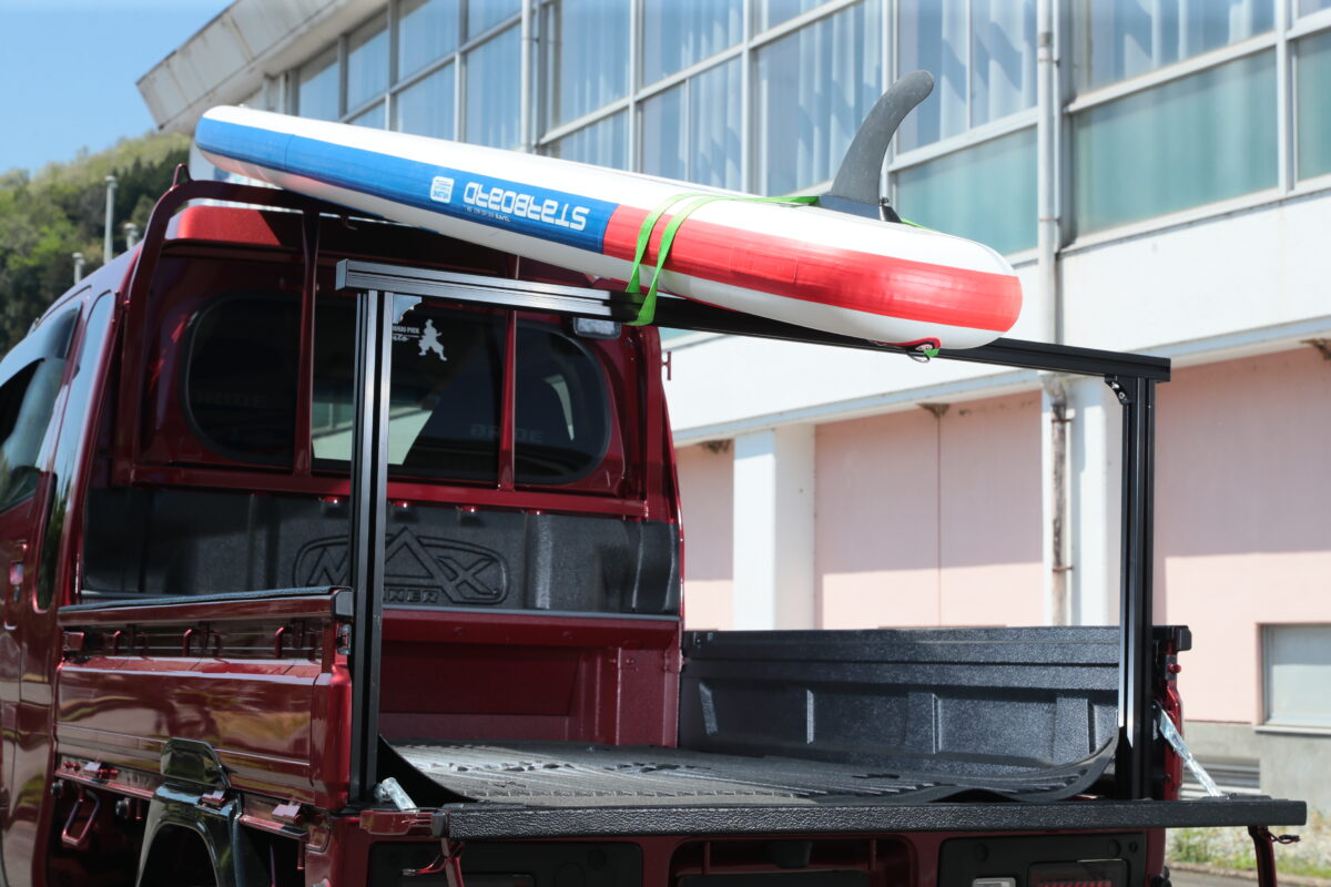 荷台最後尾にH1200(高さ1200mm)のトラレールを取り付けた状態。コクピット後端の鳥居と、トラレールの高さがほぼ高さとなり、サップは水平になった。これであればサップが風を受けることなく走行に支障を来さない。ボードを載せても、荷台に荷物を満載できるちなみにハイルーフではない軽トラであれば、H1100(高さ1100mm)を選べば水平になる。