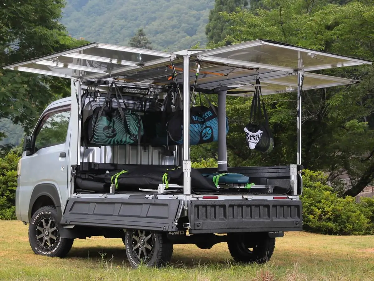 この軽トラを相棒として使いこなす人たちが注目しているのが、カーゴボックスの「ランプス」だ。アルミとステンレスで作られた軽くて丈夫なカーゴボックスは、荷台のあおりをすべて開閉でき、一般的なカーゴボックスよりも使い勝手が良いのだ。仕事から遊びまで幅広くカバーするカーゴボックスとして話題のアイテムとなっている。