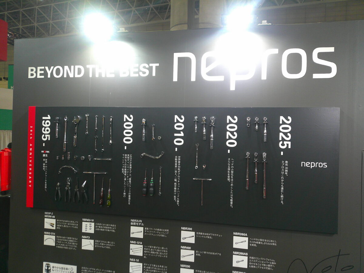 「BEYOND THE BEST」をテーマにブースを展示。1995年から2025年までのnepros工具の進化をパネルで紹介。このほか、KTCの技術力を活かしたレース車両も展示。工具の販売コーナーも設けられ、プロ仕様のアイテムが注目を集めていた。