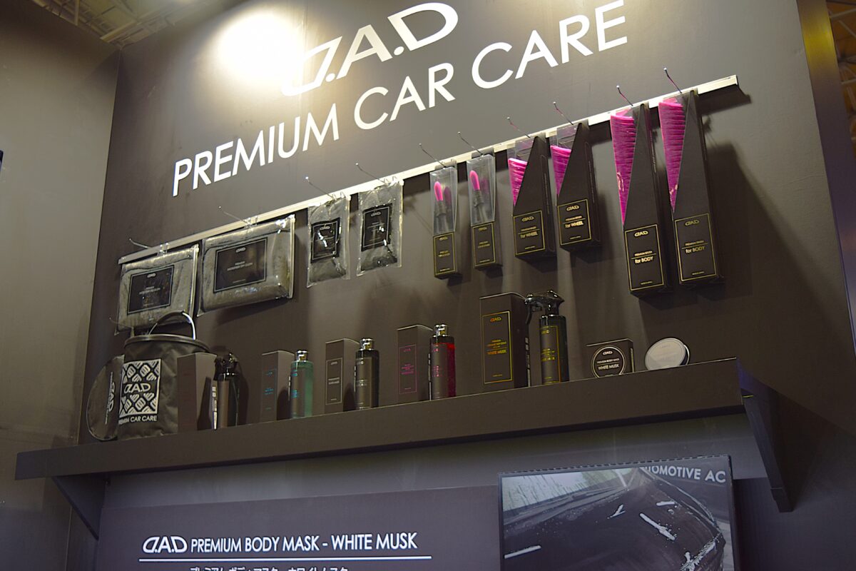 ブースでは、全面にスワロフスキーを施したメルセデス・ベンツSLKを展示。そのほか「PREMIUM BODY MASK – WHITE MUSK」などカーケア製品も紹介しており、ボディの撥水効果を示すデモパネルや、洗車用品、アクセサリーを提案していた。
