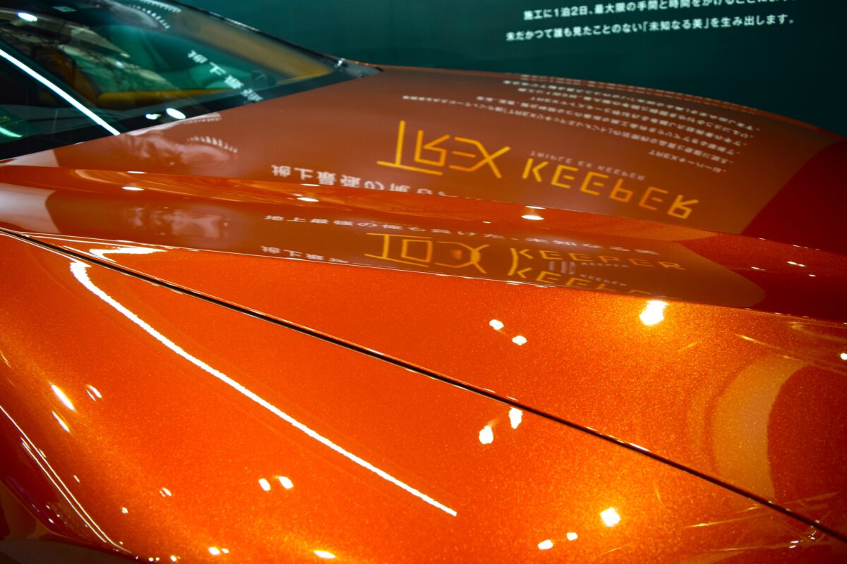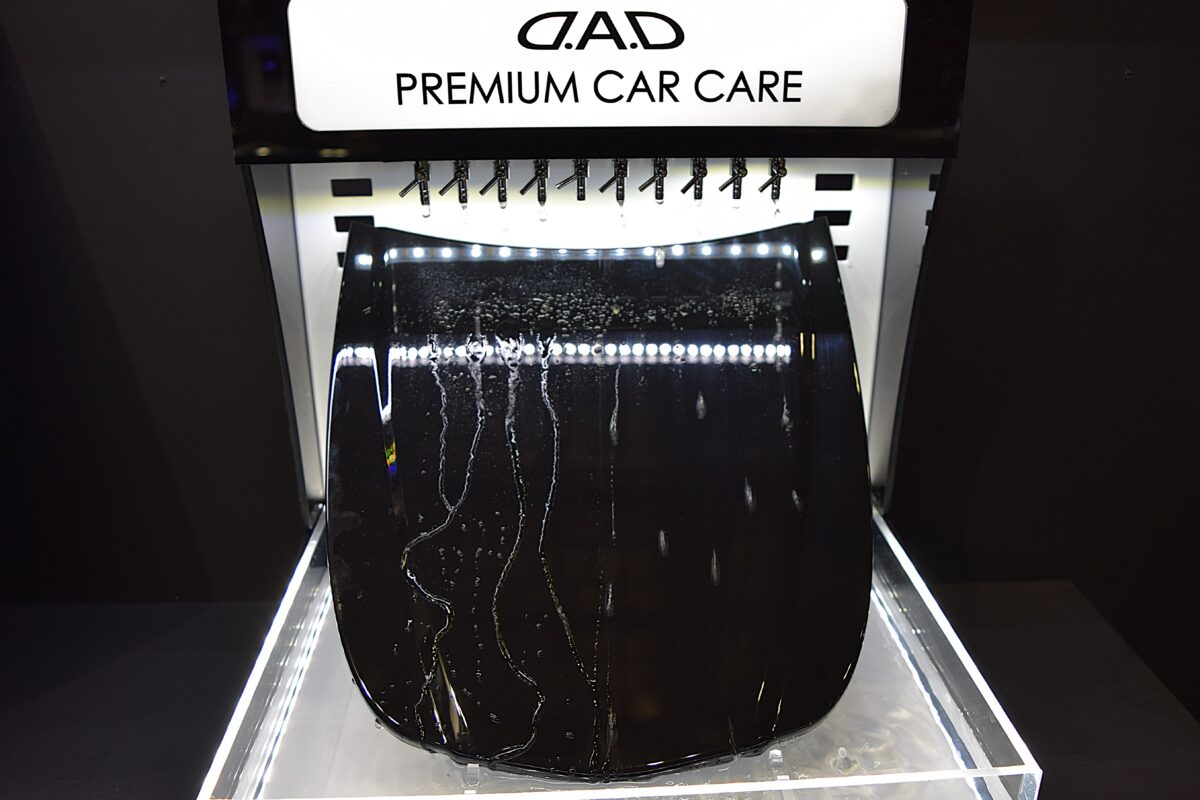 厚さ2ミクロンのガラス被膜の上に、有機質の性質を持つ「VP326」を重ね、水シミや水アカを防ぐ「EXキーパー」。その上位モデルで、3層構造を持つ「TREXキーパー」の美しい仕上がりが来場者からの注目を集めていた。