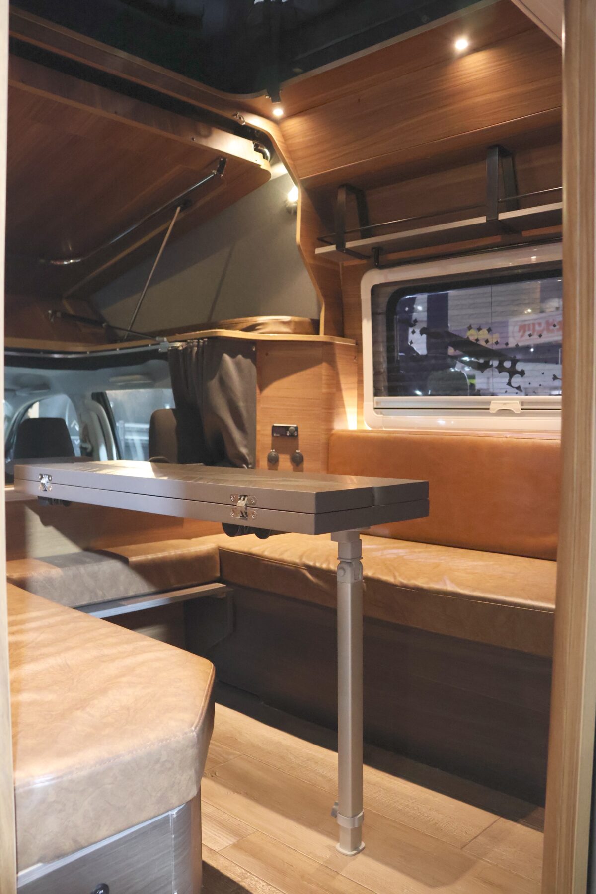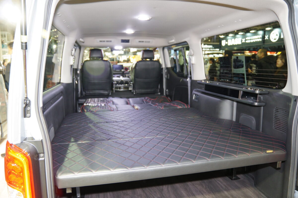 車中泊車両としてニッサン キャラバンを展示。ナローボディながらセカンドシートから続くベッドキットにより、大人が余裕を持ってヨコになれるベッドスペースを確保。スポーティなエクステリアも印象的だ。