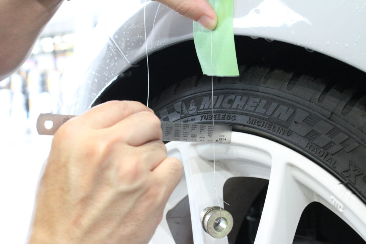足まわりの肝となるホイールオフセット/インセットは糸とバラスト(重り)を使った手作業で実施。