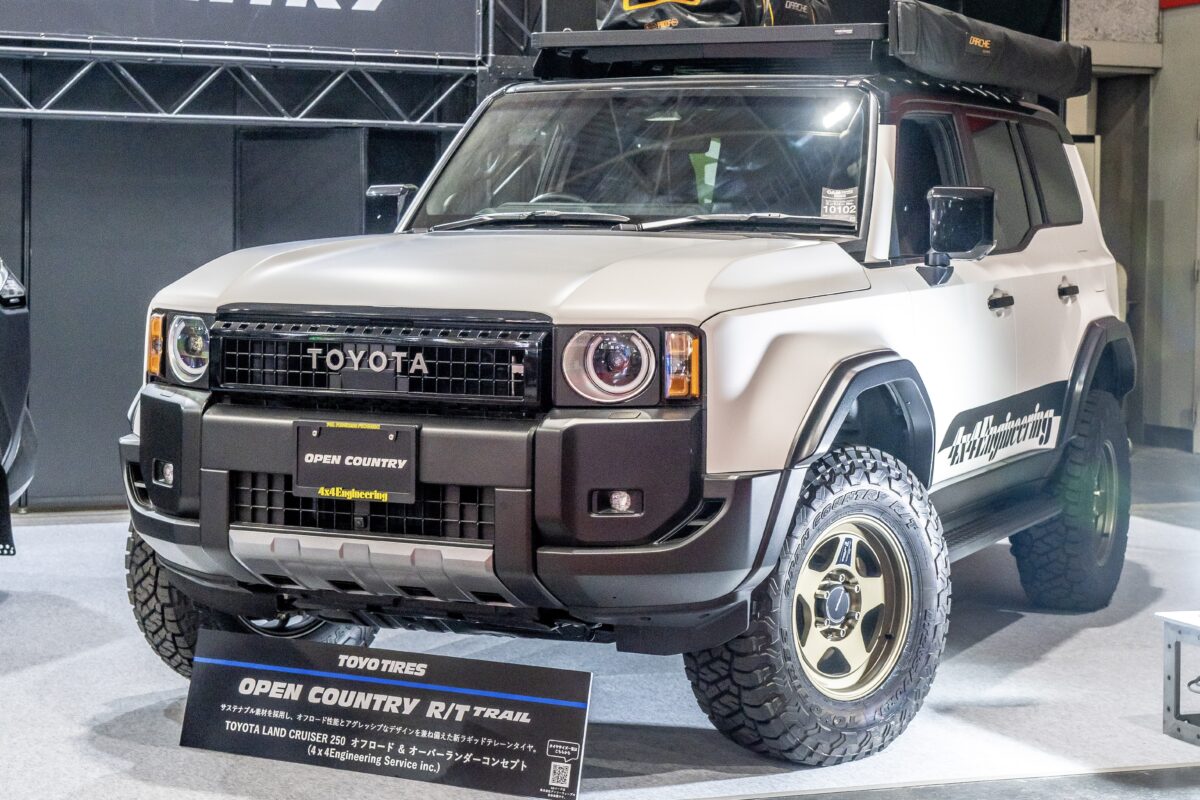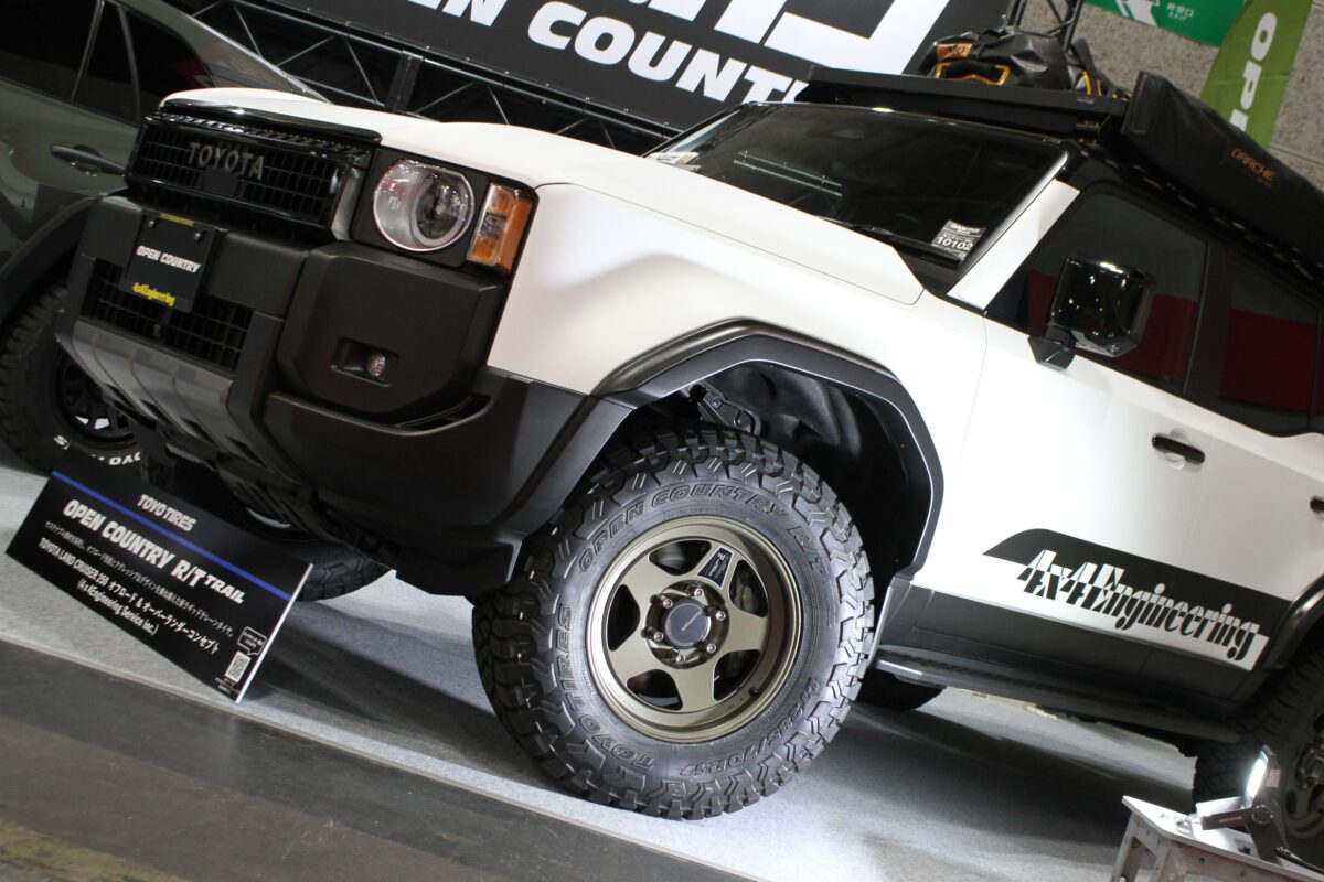 1975年の創業以来、四輪駆動車用カスタムパーツを作り続けてきた名古屋の老舗「4×4エンジニアリング」が手がけたランクル250だ。オープンカントリーの最新作「R/T トレイル」285/70R17を装着。センターリブにオンロード向けの細かなブロックを配置しつつ、ショルダー側に深い溝と大型ブロックを組み合わせた“二層構造”のトレッドが特徴だ。高速域での直進安定性を確保しながら、泥・砂利でのトラクションを確実に引き出す設計となっている。