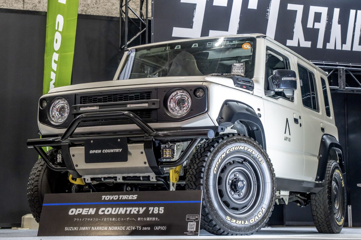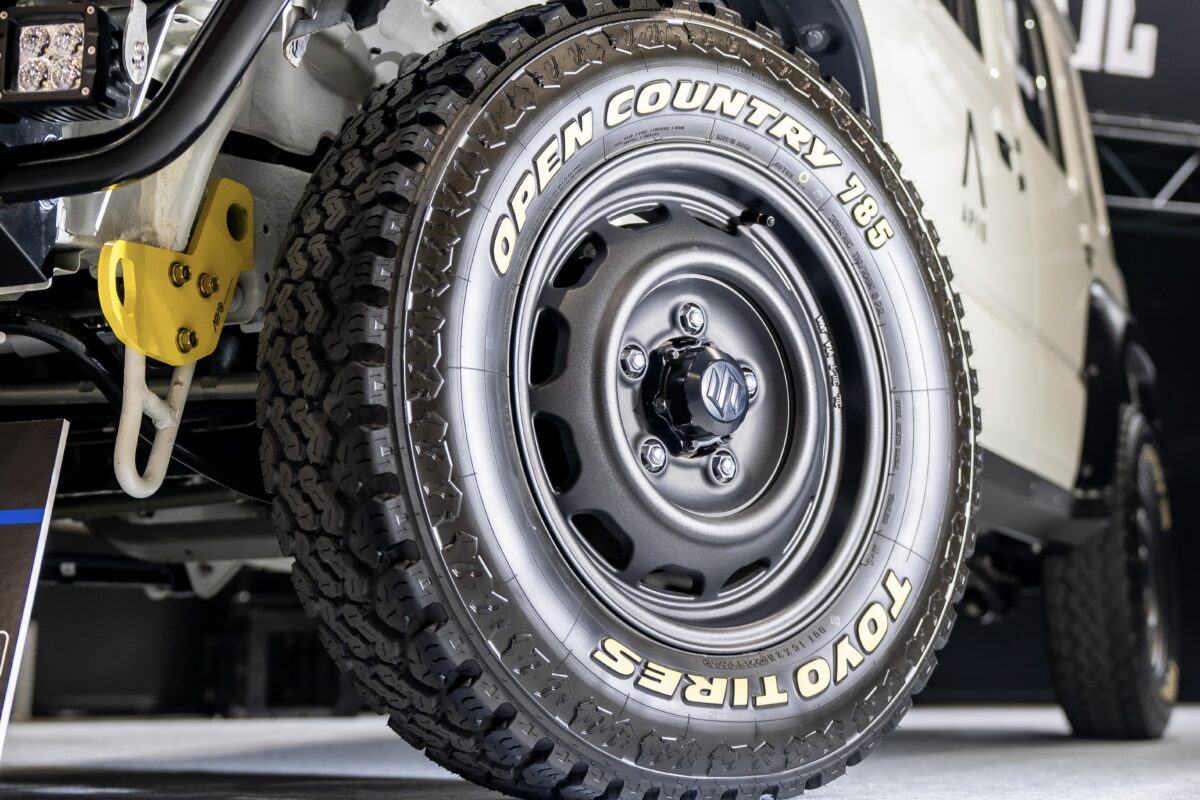 ジムニー専門の老舗チューナーとして長年の実績を誇る神奈川の「APIO(アピオ)」が手がけるジムニーノマドにはオープンカントリー「785」(205R16C 110/108N)が装着されている。1983年当時のパターンを現代に復刻させたマッドアンドスノー(M+S)タイヤで、泥濘やウェットでも確かな駆動力を発揮。サイドウォールの文字は、当時のロゴを再現したブラックレター or 洗練された印象のアイボリーホワイトレターの2種から選択可能。サイズは16インチ専用となっている。