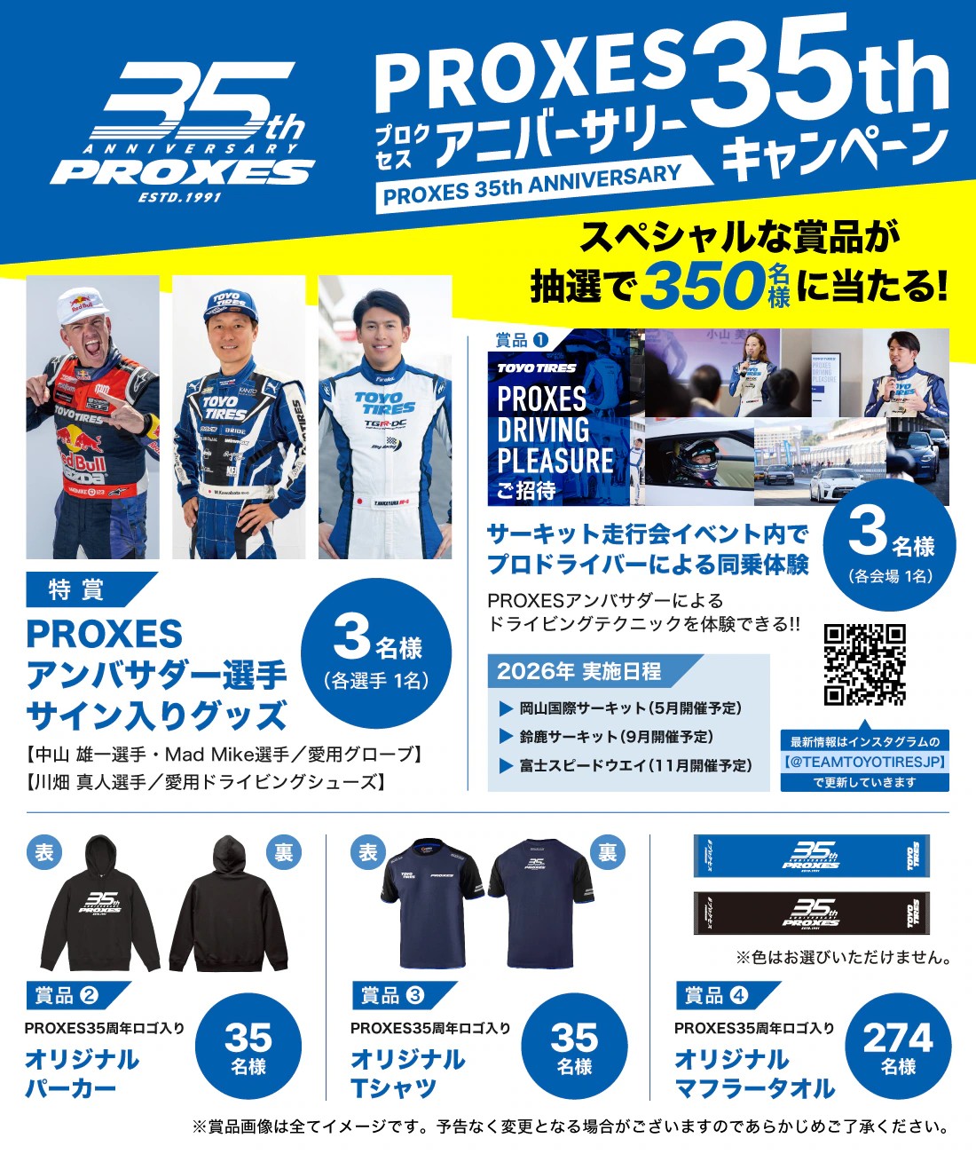 TOYO TIRESのフラッグシップブランド「PROXES」は、1991年の誕生から2026年で35周年を迎える。ハイパフォーマンスカー向けタイヤとして、SEMA装着率No.1やニュル24時間参戦など数々の実績を積み重ねてきた節目の年だ。現在は35周年を記念したキャンペーンが実施され、アンバサダー選手のサイン入りグッズやサーキット同乗体験、35周年ロゴ入りパーカー・Tシャツ・タオルなどが抽選で当たる特別企画も展開されている。