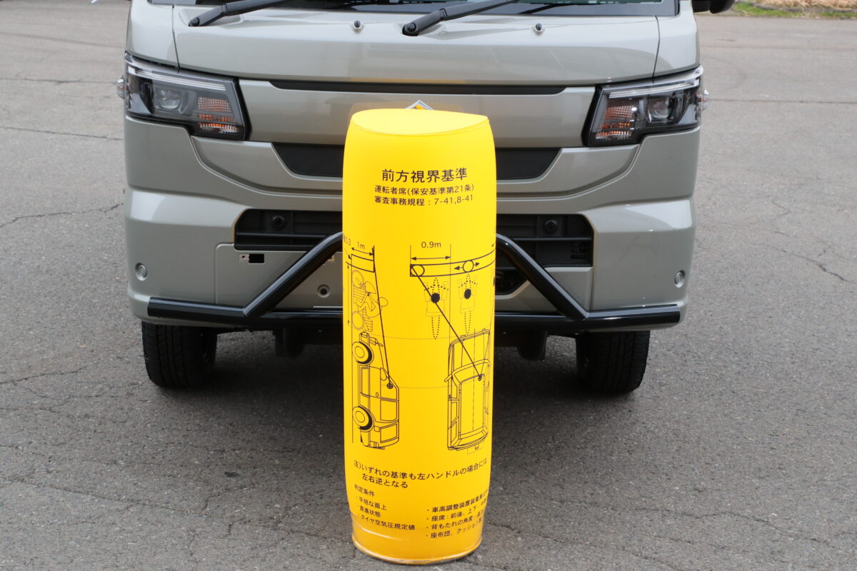 自動車の前方2mにある高さ1m、直径0.3mの円柱(6歳児を模したもの)を鏡等を用いず直接視認できること。