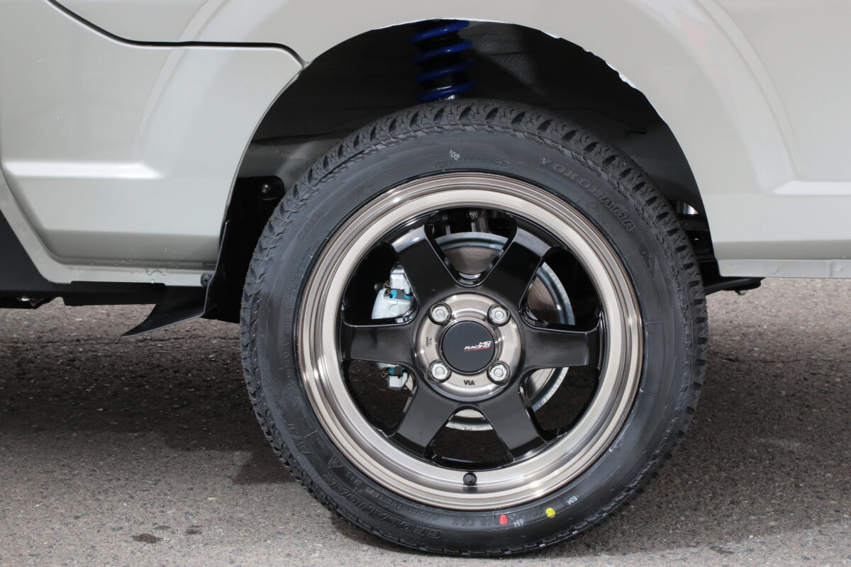 40mmリフトアップした新型エブリイ。ホイールはMID RACING R06(15×5J +45)で、タイヤはヨコハマ・ジオランダーA/T(165/55R15)を装着する。