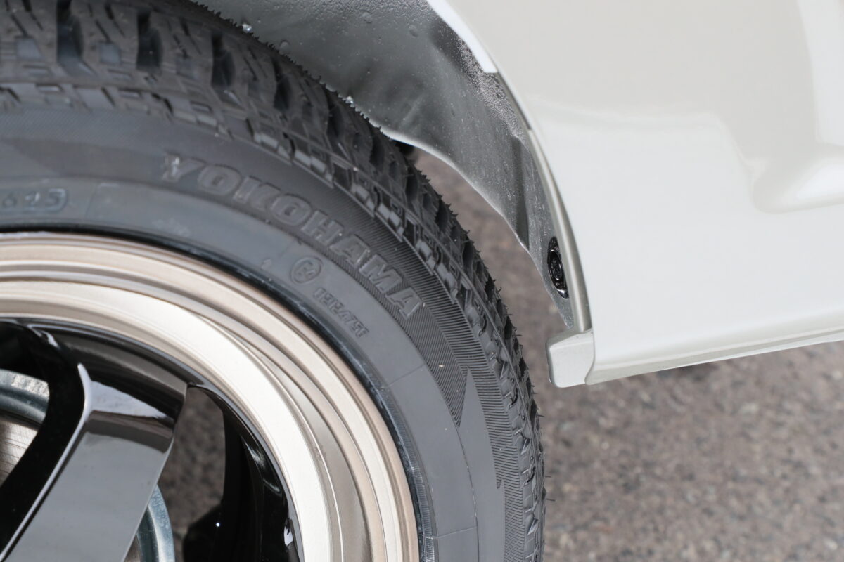 ハンドルを少し切った状態。タイヤハウスの角とのクリアランスはとても狭い。