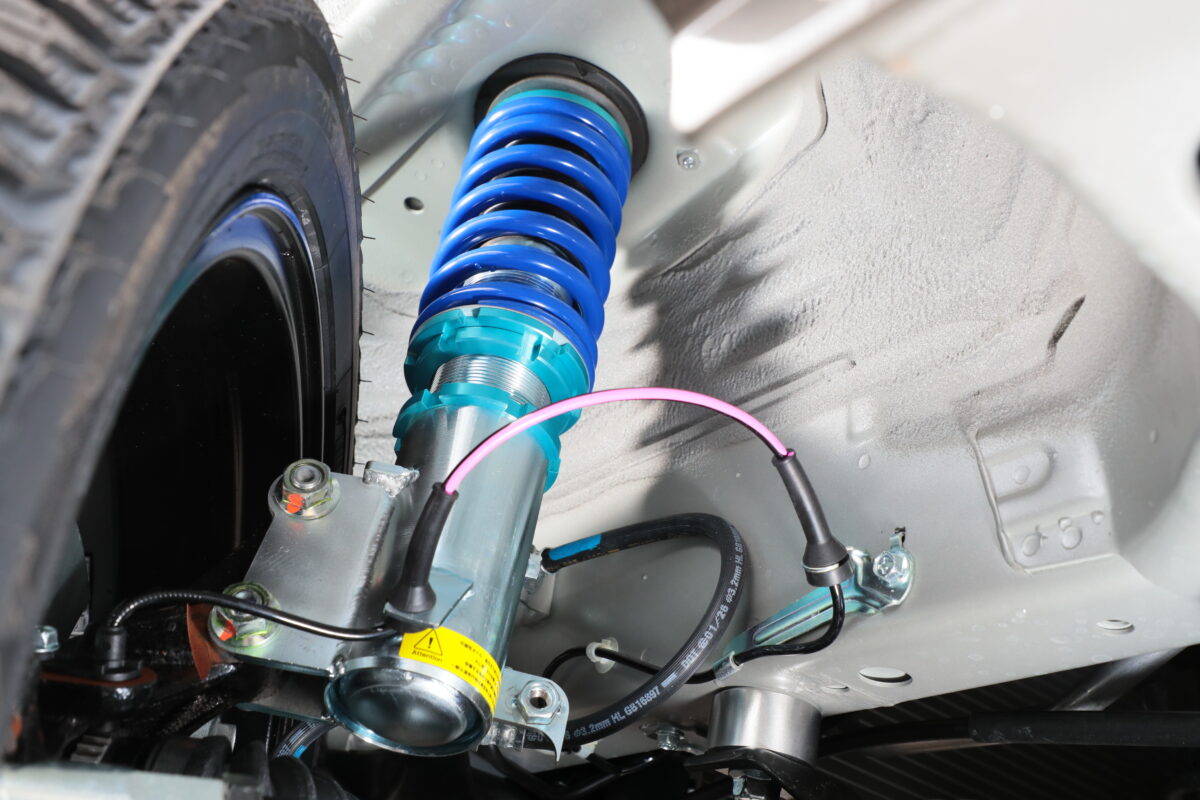 フロントに装着した複筒式の全長式車高調。このほか単筒式車高調も用意。