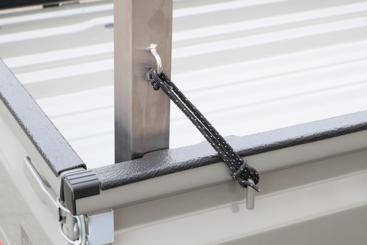 また、バーのスライド機構によるガタ付きは、アオリにフレームを挟み込むこ構造により、しっかり抑えられている。さらにフレーム外側にあるフックに付属のシートロープをかけることで、フレームを安定させながら、万一の脱落も防止できる。