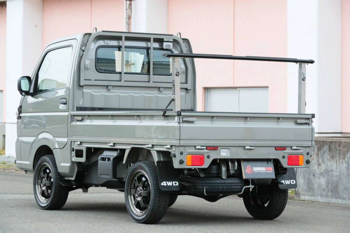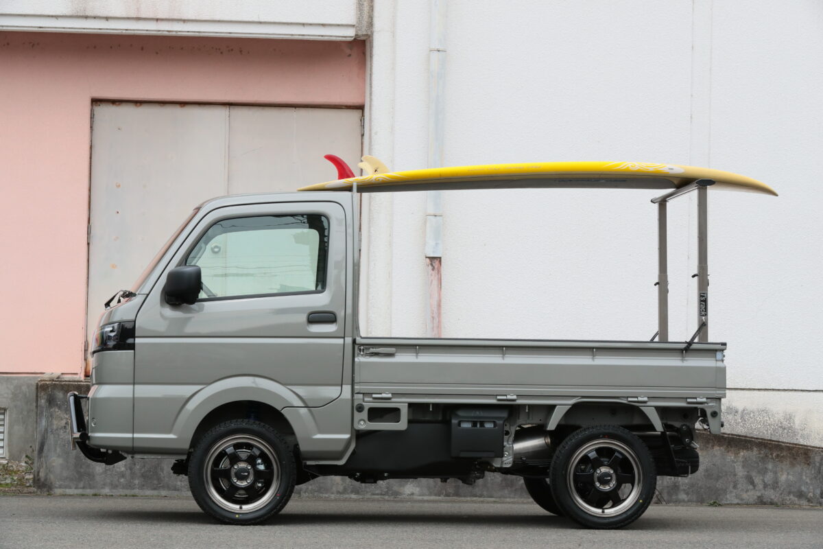 キャリイ&スーパーキャリイのキャビン後の鳥居と水平の高さを用意しており、長尺モノを安定して関崎できるのが魅力。風の抵抗による走行性能の低下や落下するリスクも大きく減らせるというわけだ。