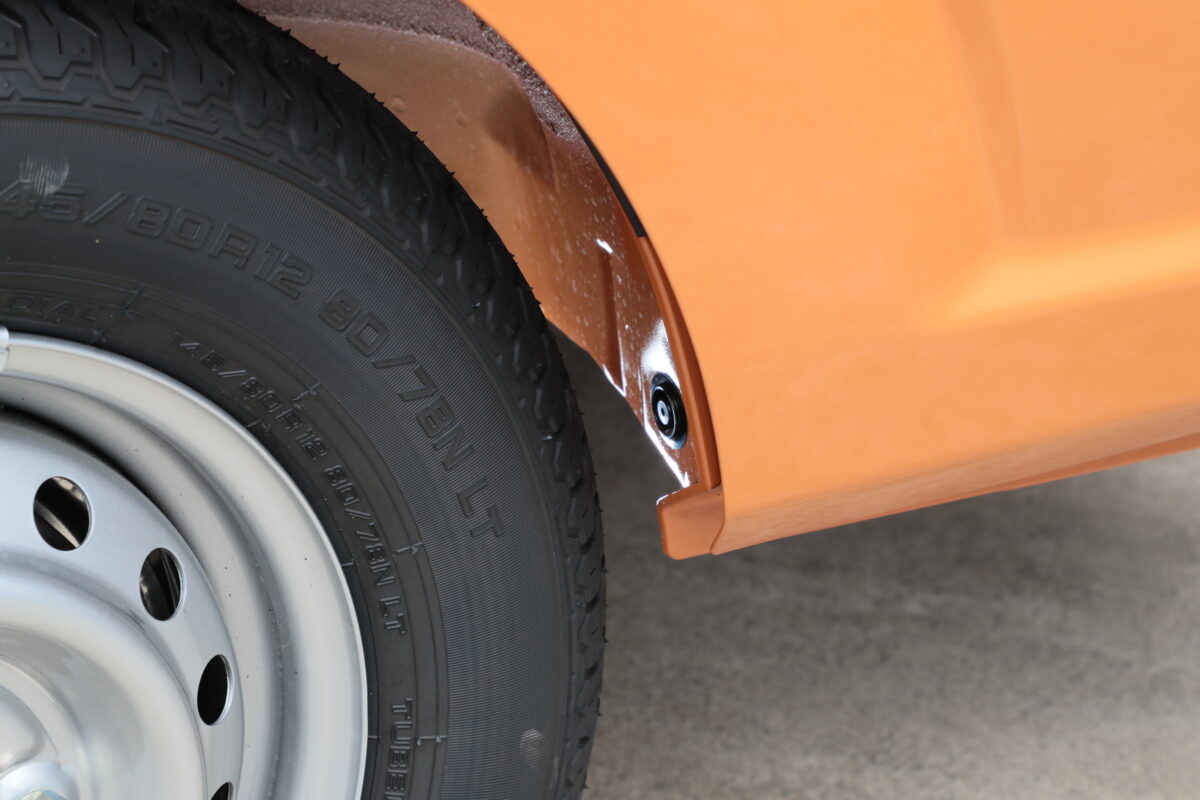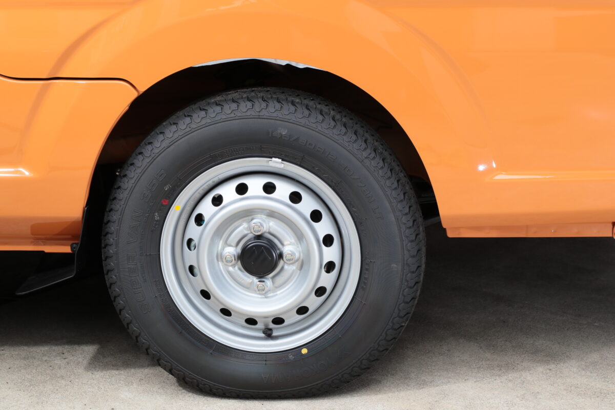 純正タイヤは、145/80R12。例えば1インチアップのタイヤサイズ145R13を装着しようにも、タイヤハウスが狭いため干渉してしまうという。ライバル車のハイゼットであれば、純正車高のままで165/60R15も履けるが、新型キャリイではそうもいかないのだ。