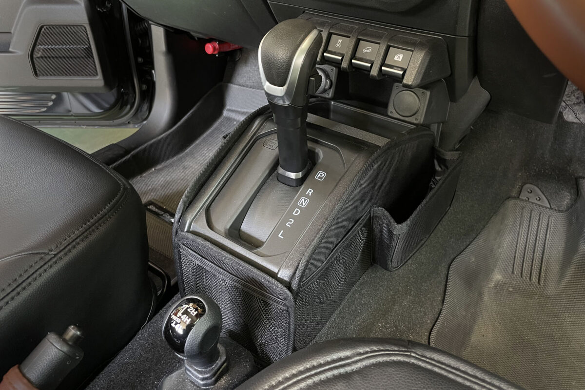 AT車のギアボックス(シフト)用の設計となっております。ジムニー(JB64/74)AT車のギアボックスに被せるだけでポケットが増設できます。ポケットは全部で5つ、そのうち3つがメッシュポケットです。