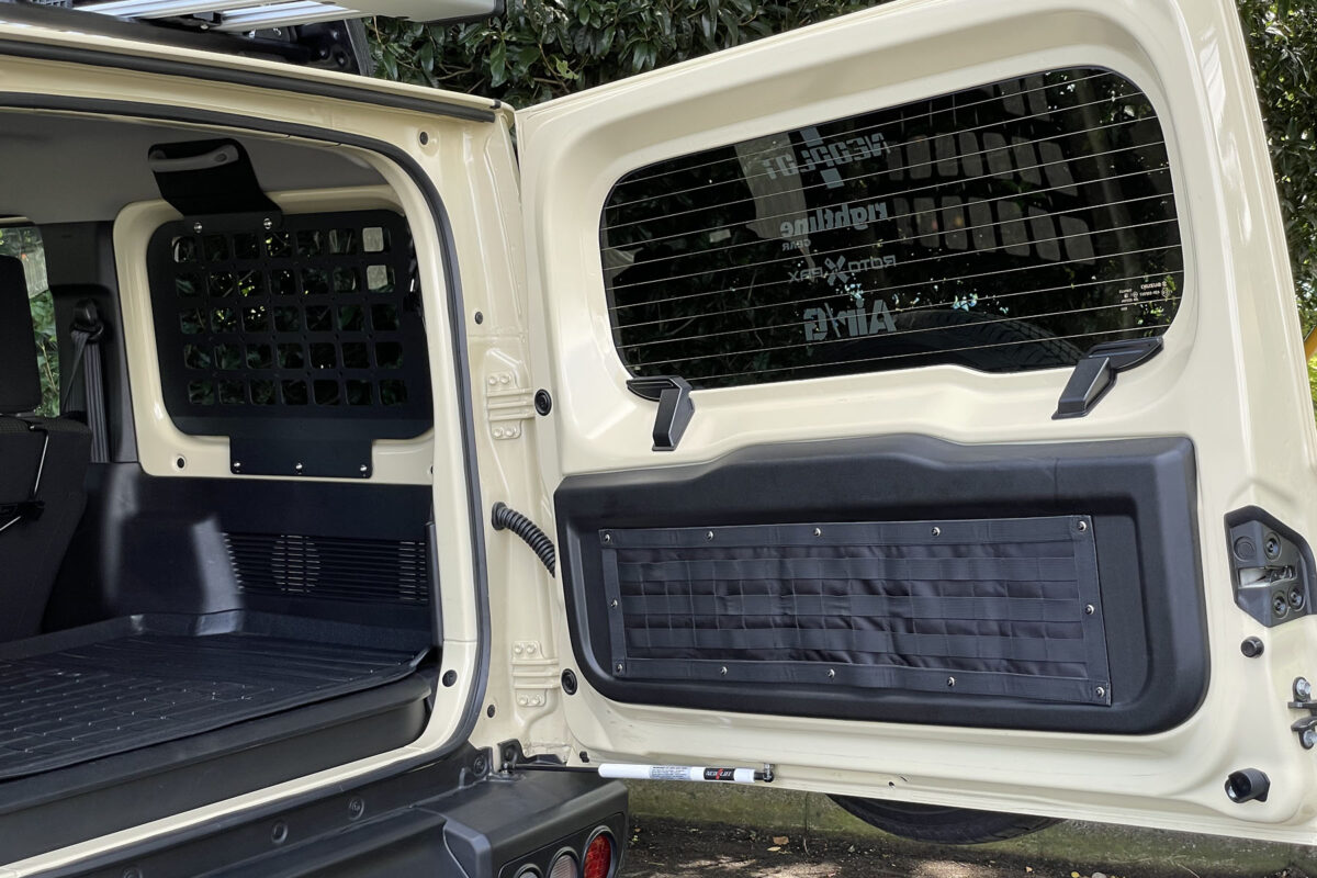 ジムニー(JB64/74)のバックドアに装着するストレージモールシステムです。カラビナやストラップなどを使用して様々なガジェットを掛けたり固定したりできます。※装着にはタッピンビス(付属)留め加工が必要です。