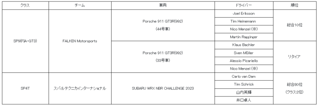 また、「SP4T」クラスで参戦していた「スバルテクニカインターナショナル」の「SUBARU WRX NBR CHALLENGE 2023」は クラストップを走行中にマシントラブルが発生してしまいますが、4時間半を超えるチームスタッフの懸命な修復作業によりレースに復帰し、総合80位、クラス2位で完走を遂げました。