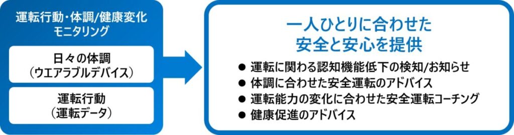 今後、本共同研究で得られた成果を生かして、日々の体調や運転行動などをモニタリングすることで、体調不良や運転に関わる認知機能低下の検知とお知らせの他、体調や運転能力の変化に合わせた安全運転のアドバイス、健康促進のアドバイスを行うことを検討するなど、一人ひとりに合わせた安全と安心を提供できるよう、新たなソリューションの創出へ取り組んでいきます。