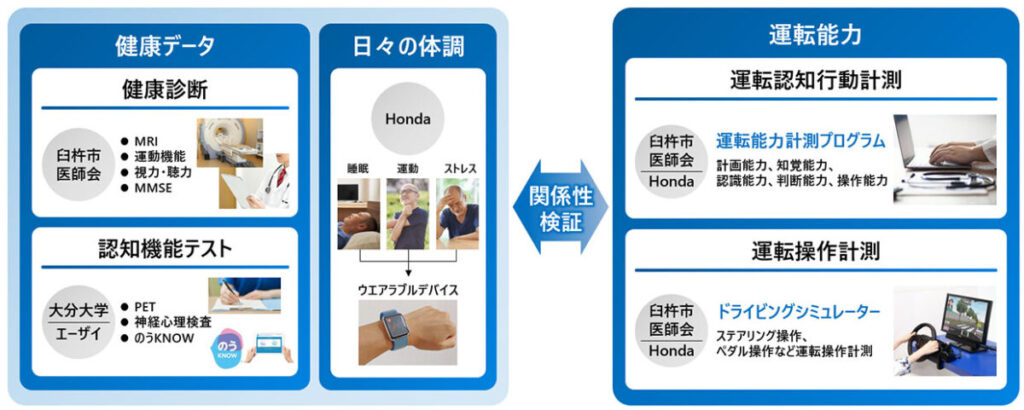 健康データを収集するために、臼杵市医師会立市民健康管理センターにて健康診断と認知機能テストの一部を、大分大学医学部神経内科学講座にて主に認知機能テストを実施します。認知機能テストには臨床診断のための画像検査と神経心理学的検査に加えて、エーザイの脳の健康度セルフチェックツール※1を使用します。同時に、日々の体調データを、対象者が装着するウエアラブルデバイスを用いて測定します。また、運転能力(運転認知行動と運転操作)を、臼杵市医師会立コスモス病院にて、Hondaのドライバー行動・状態モニタリング研究技術を活用したツール※2を使い計測することで、健康データや日々の体調と運転能力がどのような関係性を有しているのかを検証します。