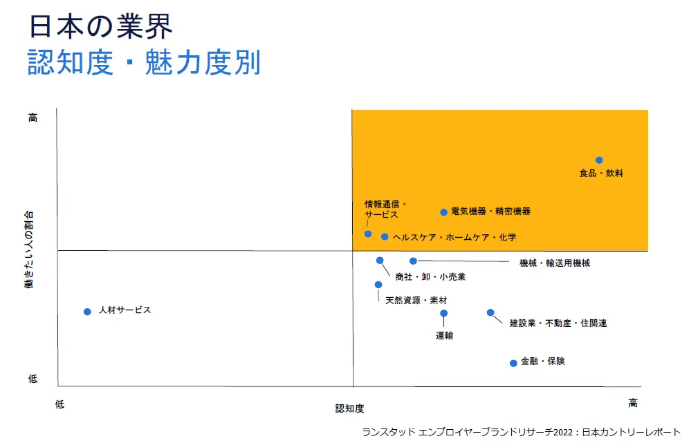 日本において認知度が高く、更に魅力度が高く働きたいと評価されたのは、群を抜いて「食品・飲料業界」という結果になりました。その他には、「電子機器・精密機器業界」、「情報通信・サービス業界」と「ヘルスケア・ホームケア・化学」が挙げられました。
