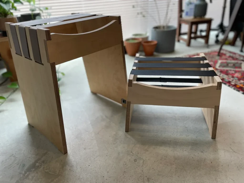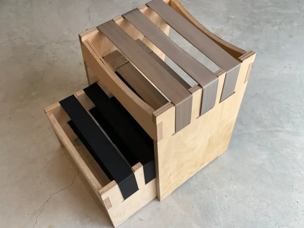 廃棄される車のシートベルトを活用し、植林木100%のホワイトバーチ合板とシートベルトだけで作られた、サスティナブルな組み立て式スツールを開発