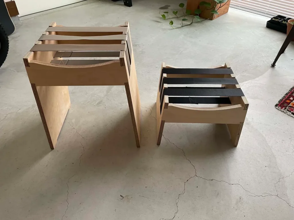 廃シートベルトと無垢のホワイトバーチ合板を使用している為、個体差がある自分だけの一脚に