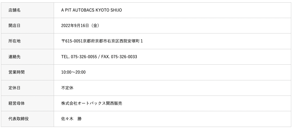 株式会社オートバックスセブン(代表取締役 社長執行役員:堀井勇吾)と加盟店契約を結んでいる株式会社オートバックス関西販売(代表取締役:佐々木勝)は、オートバックスグループのフラッグシップ店舗「スーパーオートバックス京都ワウワンダーシティ」をリニューアルし、2022年9月16日(金)に、「A PIT AUTOBACS KYOTO SHIJO」としてオープンいたします。