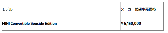 ビー・エム・ダブリュー株式会社(代表取締役社長: 長谷川正敏)は、ハイ・グレードな装備、専用ボディ・カラーを施した限定車「MINI Convertible Seaside Edition(コンバーチブル・シーサイド・エディション)」を、日本全国180台限定にて、全国のMINI正規ディーラーにおいて、本日より販売を開始する。納車は、本年4月下旬以降を予定している。
