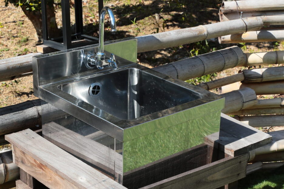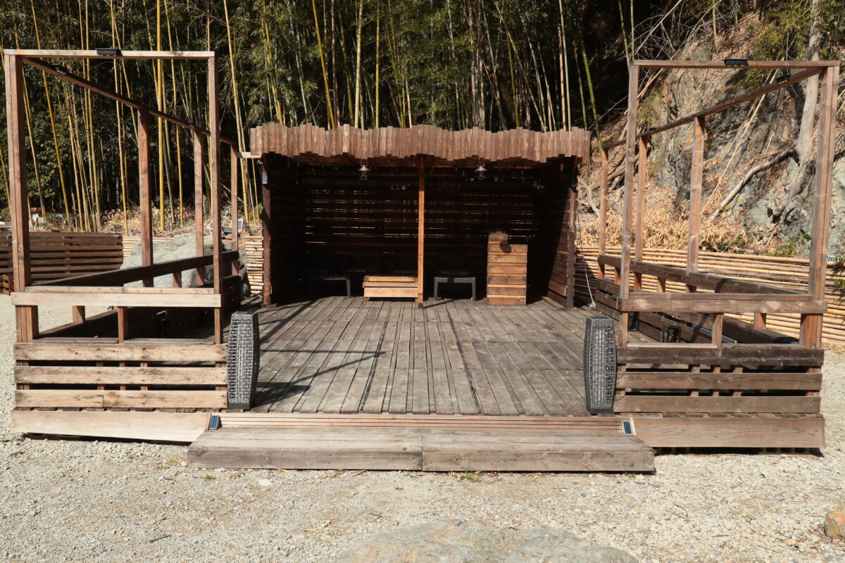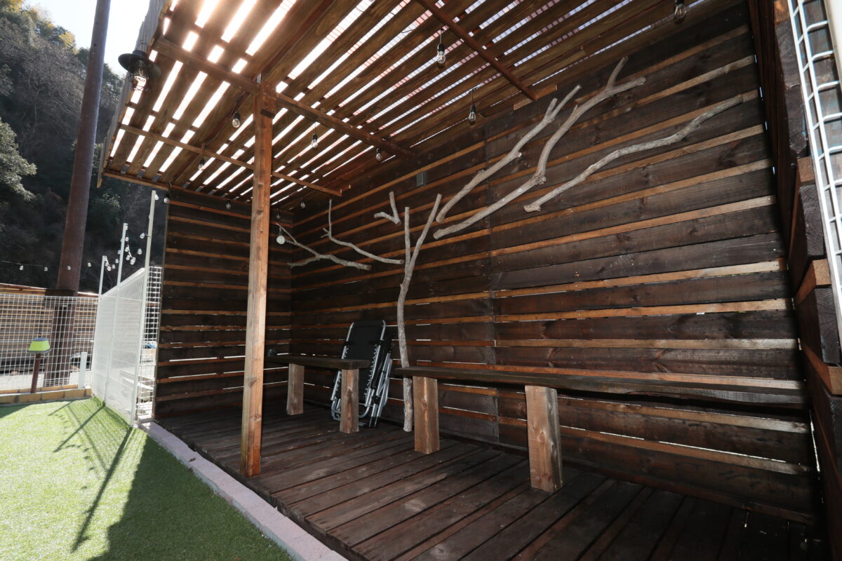 キャンプサイトの前には、BBQスペースを用意。デイキャンプ用に向けた施設で、南国リゾートを思わせるウッドデッキがオシャレな空間だ。ゆったりした椅子やテーブルを配置。水場にBBQコンロも用意されており、食べ物を持ち込めば、大人数でのBBQが楽しめる。