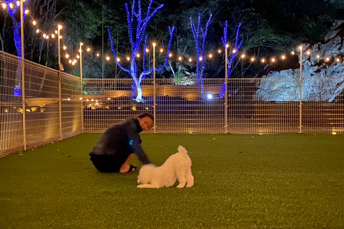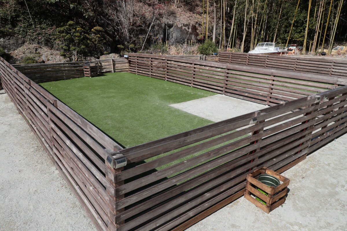 広々とした空間のなか、白い柵で囲われた10m×20mのドッグランには、一面人工芝が敷かれており、大きなワンコたちも伸び伸びと走り回ることができる。人工芝が全面に敷かれており、汚れることはない。ドッグランは貸し切り可能なので、他のワンコたちに気兼ねせず、自由自在に走り回れるのも魅力。
