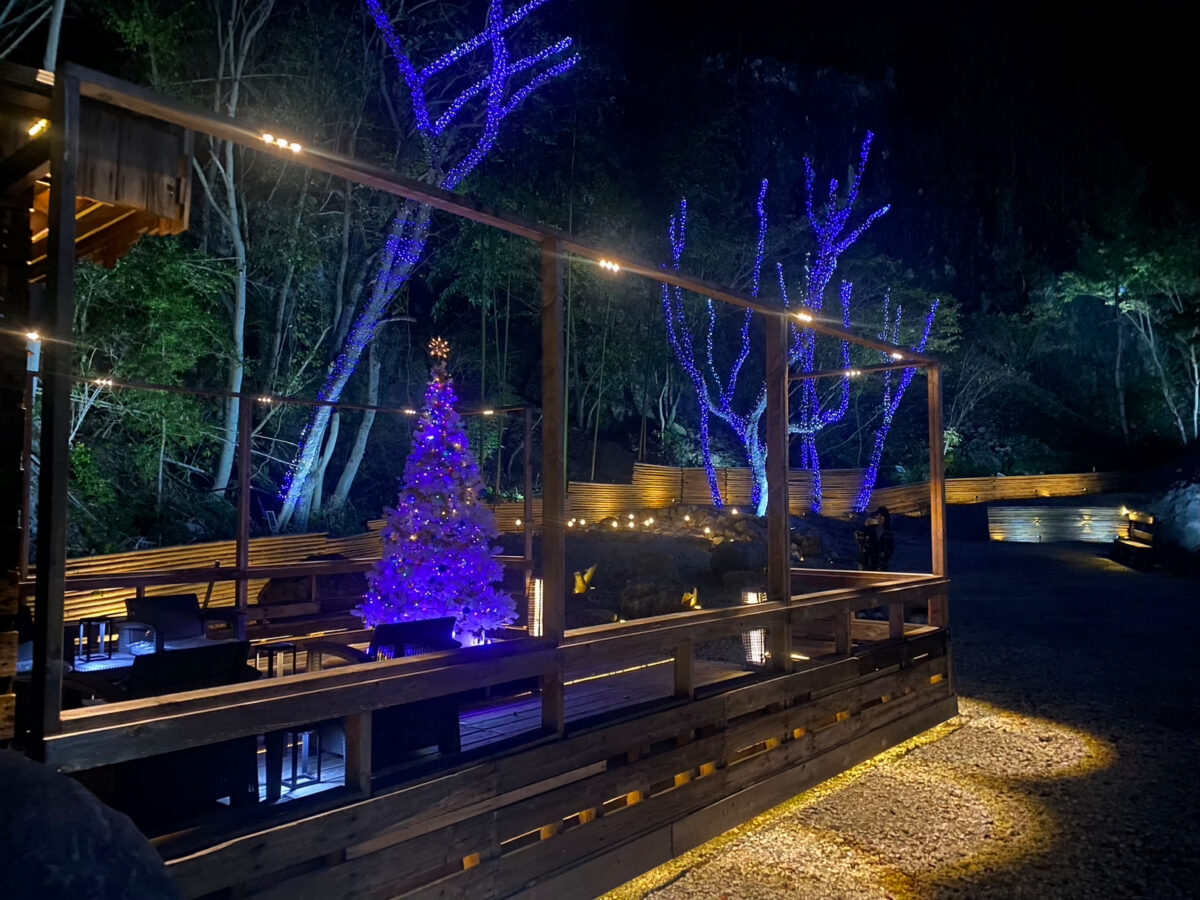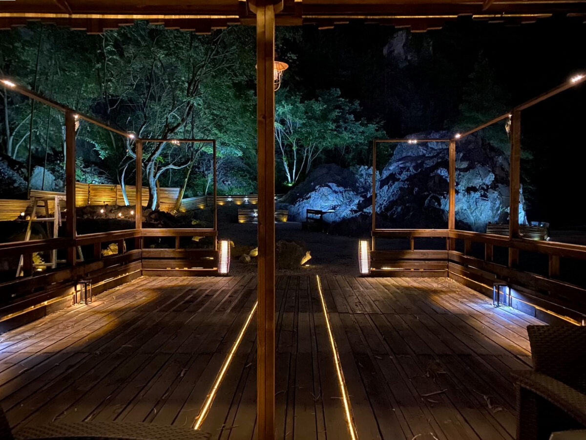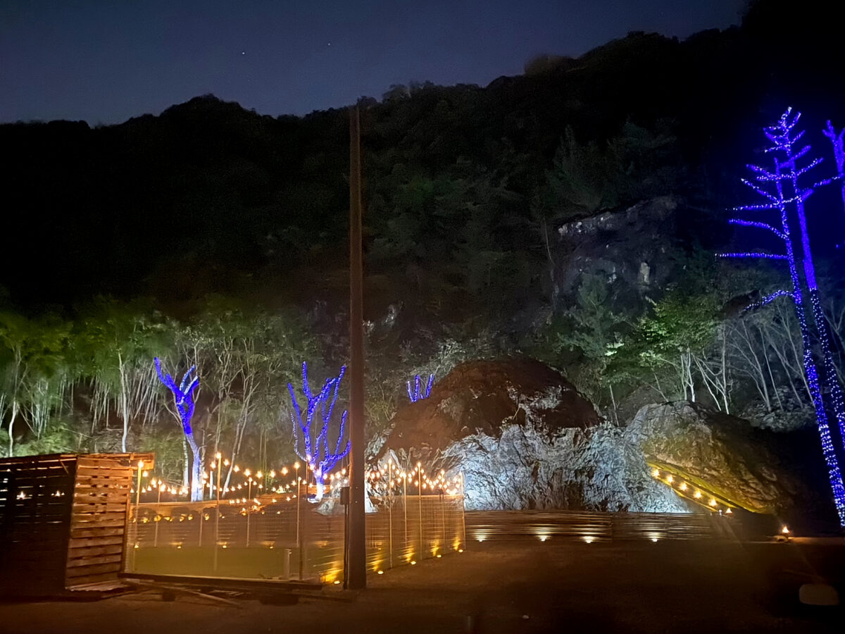 夜になれば、その魅力は倍増! デーモンロックやそそり立つ岩肌、周囲の木々、キャンプサイト、ドッグラン、カフェ&バーにいたるまで、数え切れないくらいのLEDでライトアップ! 眼前に幻想的な世界が広がり、頭上には視界を遮ることのない星々のきらめきを堪能できる。