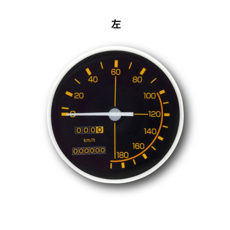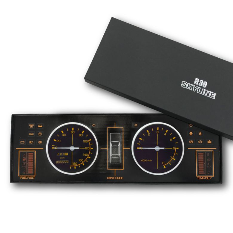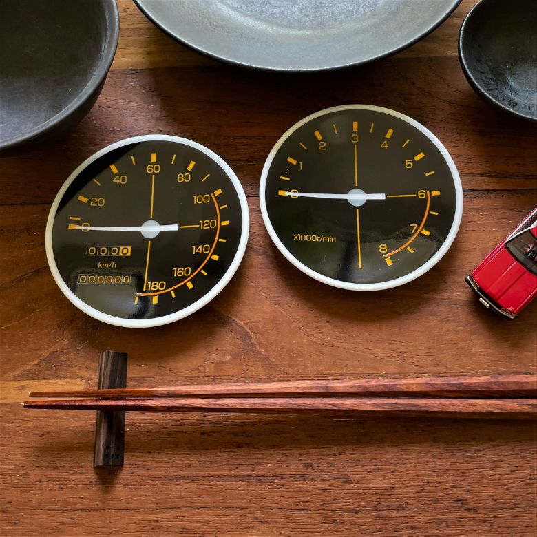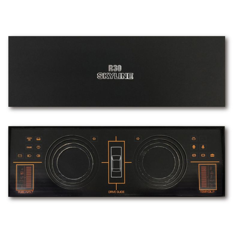 特徴:ゼロが水平指針のスピード&タコメーターが特徴的だったR30型スカイラインのスピードメーターとタコメーターをデザインした小皿セットである。イエローオレンジとアンバーの色が80年代を色濃く感じさせるメーターパネルをデザインした専用のケース付きである。