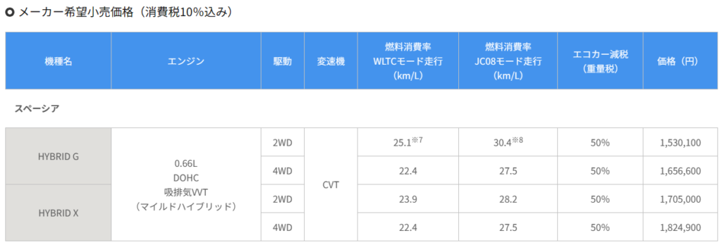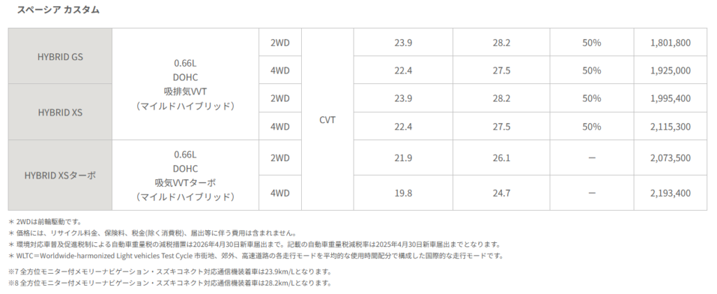 ※4 軽ハイトワゴン=全高1,700mm以上のハイト型2BOX軽自動車。WLTCモード走行燃費(国土交通省審査値)に基づく。スペーシア HYBRID G 2WD車(全方位モニター付メモリーナビゲーション・スズキコネクト対応通信機装着車は除く)。2023年11月現在、スズキ調べ。