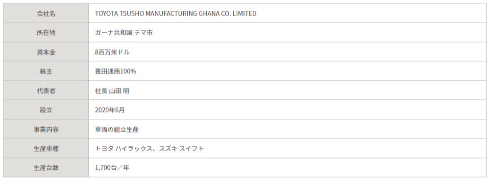 スズキ株式会社は、豊田通商株式会社のガーナ共和国における車両組立会社であるTOYOTA TSUSHO MANUFACTURING GHANA CO. LIMITEDが小型車「スイフト」の生産を開始したと発表した。「自動車産業の発展に向けた協業に関するMOU」に基づく取り組みの一環としており、アフリカにおけるスズキ車の生産、トヨタ自動車株式会社「ハイラックス」との2ブランド混流生産は初めてとなった。