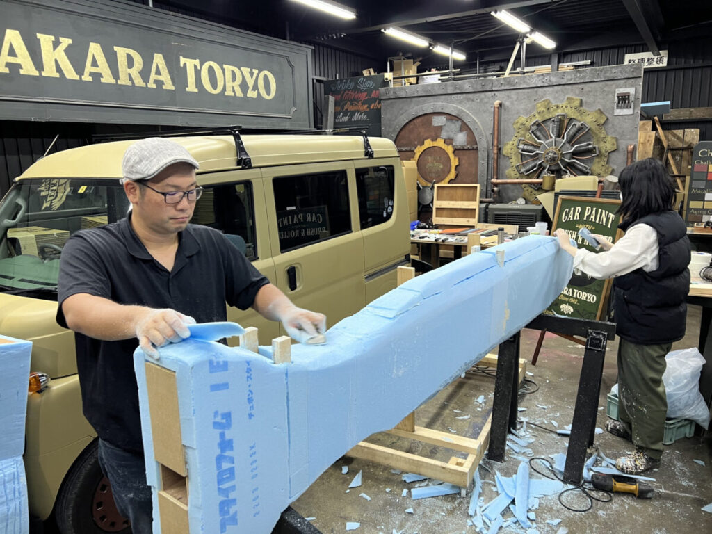 4m級巨大刷毛型看板を展示車両上に設置します。ブース内を彩るタカラ塗料らしさが詰まった手作りの装飾品、色見本ミニカーも見どころの一つです。